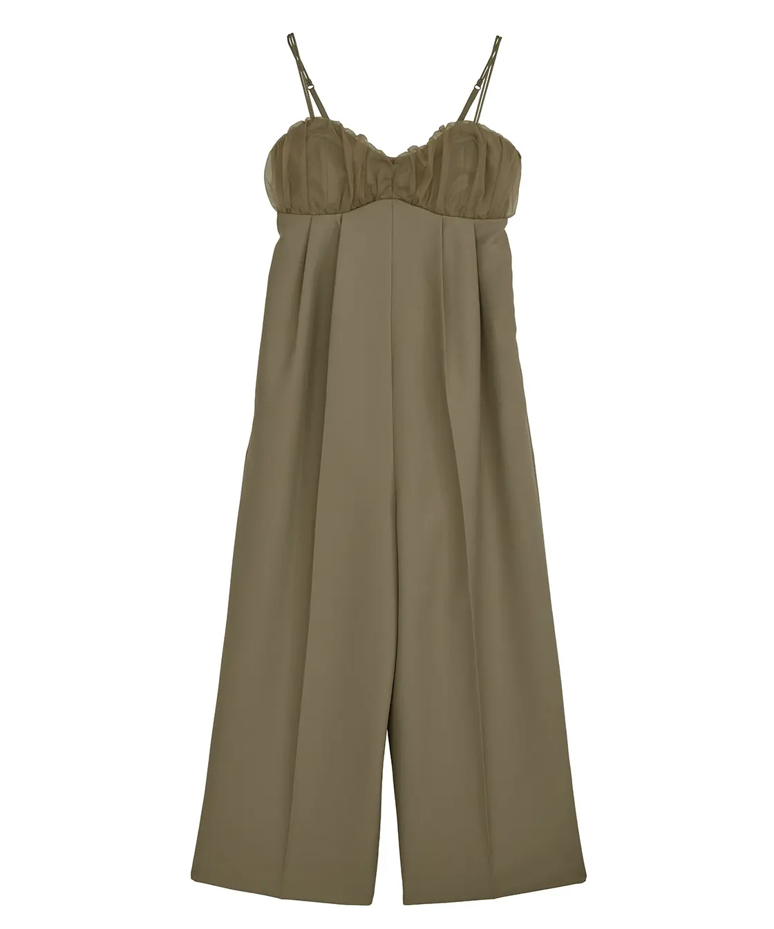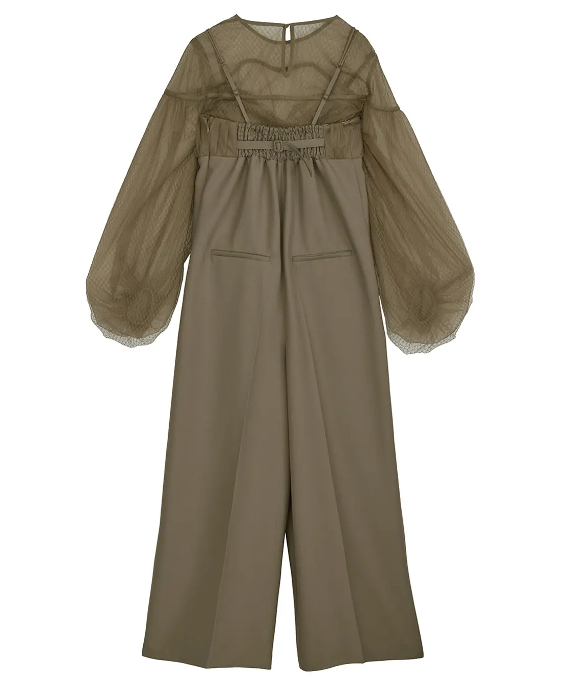 繊細なネットチュールのショートトップスとモードなロンパースのセットアイテム。