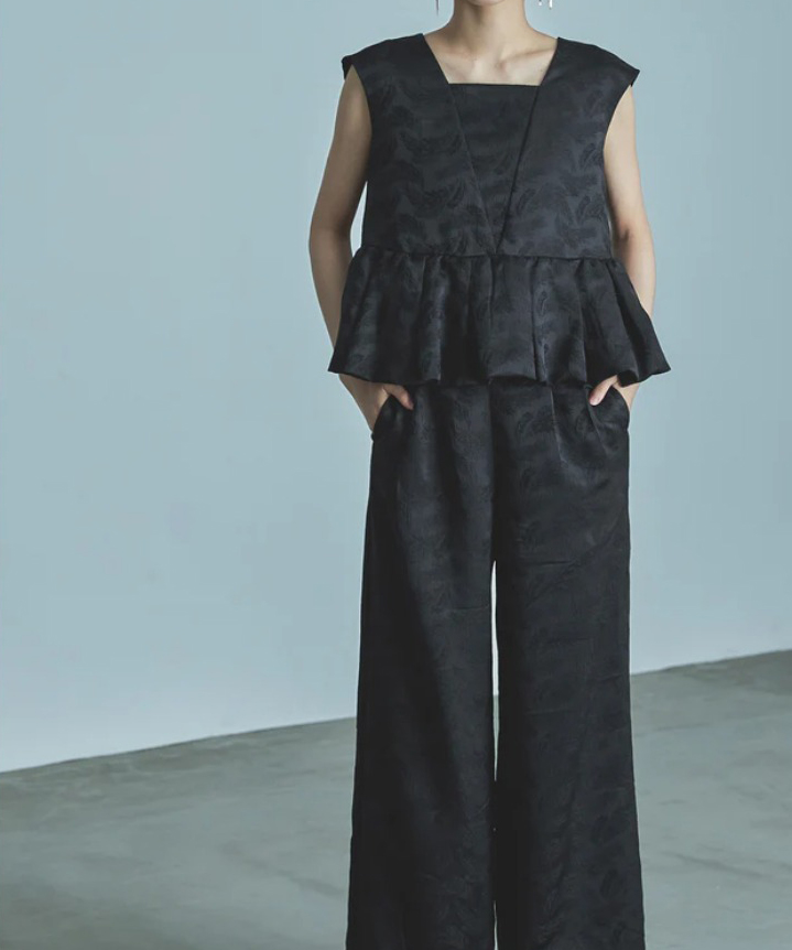 ボリュームのあるペプラムデザインで女性らしいシルエットに仕上げたトップスと、フェザー柄のジャガード素材で仕上げたパンツのモード感溢れるセットアップです。