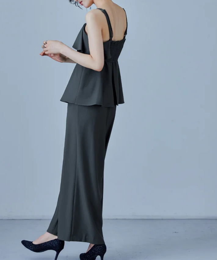 アシンメトリーなペプラムデザインのキャミソールオールインワン。