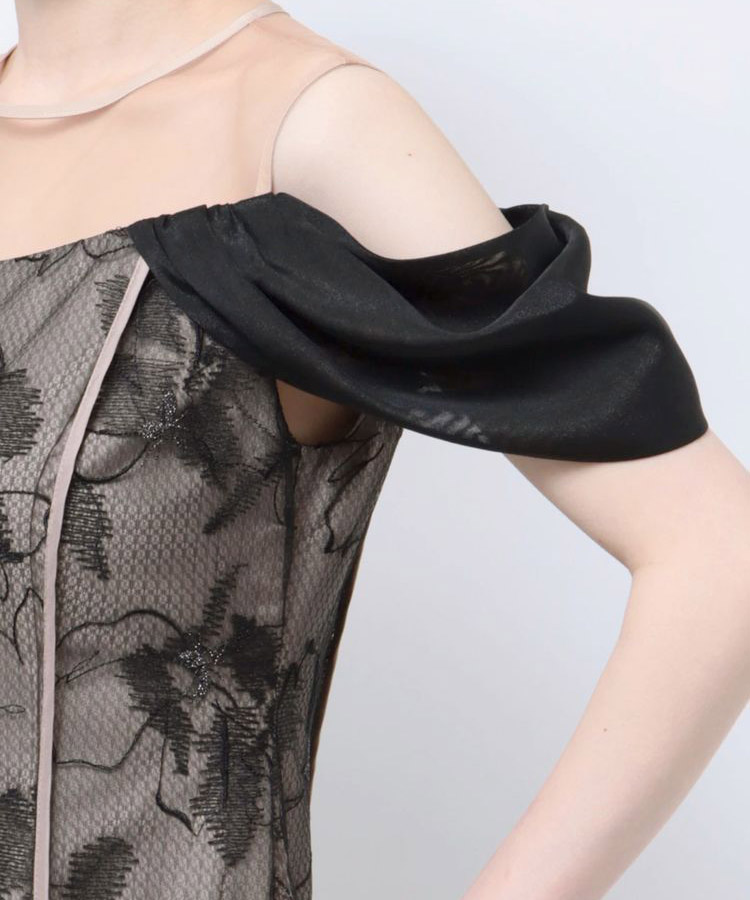 表情のあるチュールに部分的にラメ糸を使用した華やかでモダンな印象の刺繍を施した上品なワンピース。
