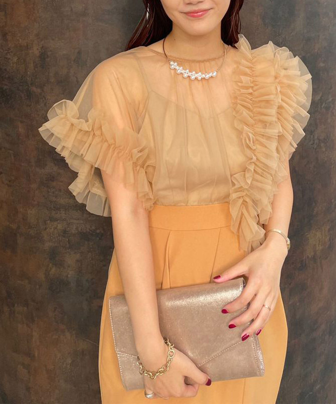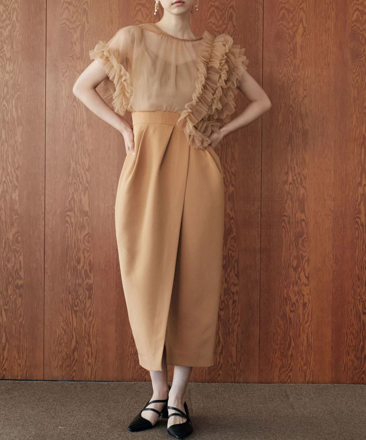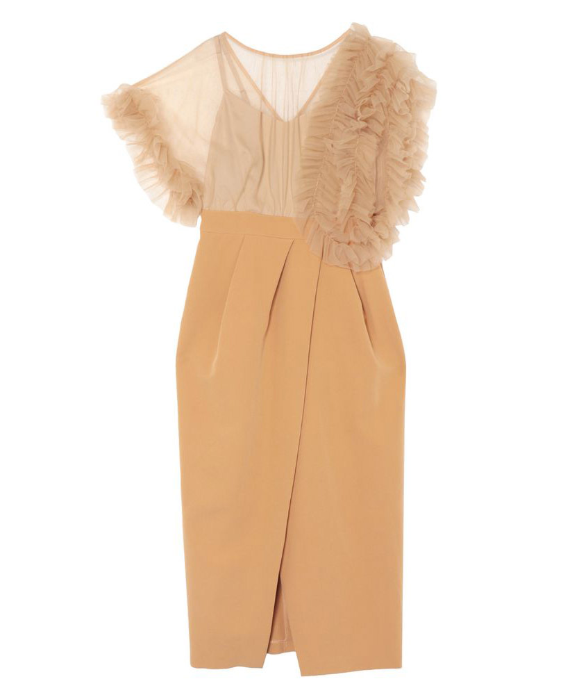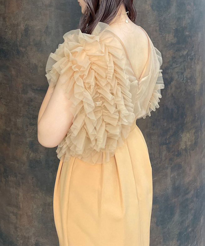 チュールにたっぷりとギャザーを寄せ、左右アシンメトリーにフリルを施したデザインが華やかなオケージョンドレス。