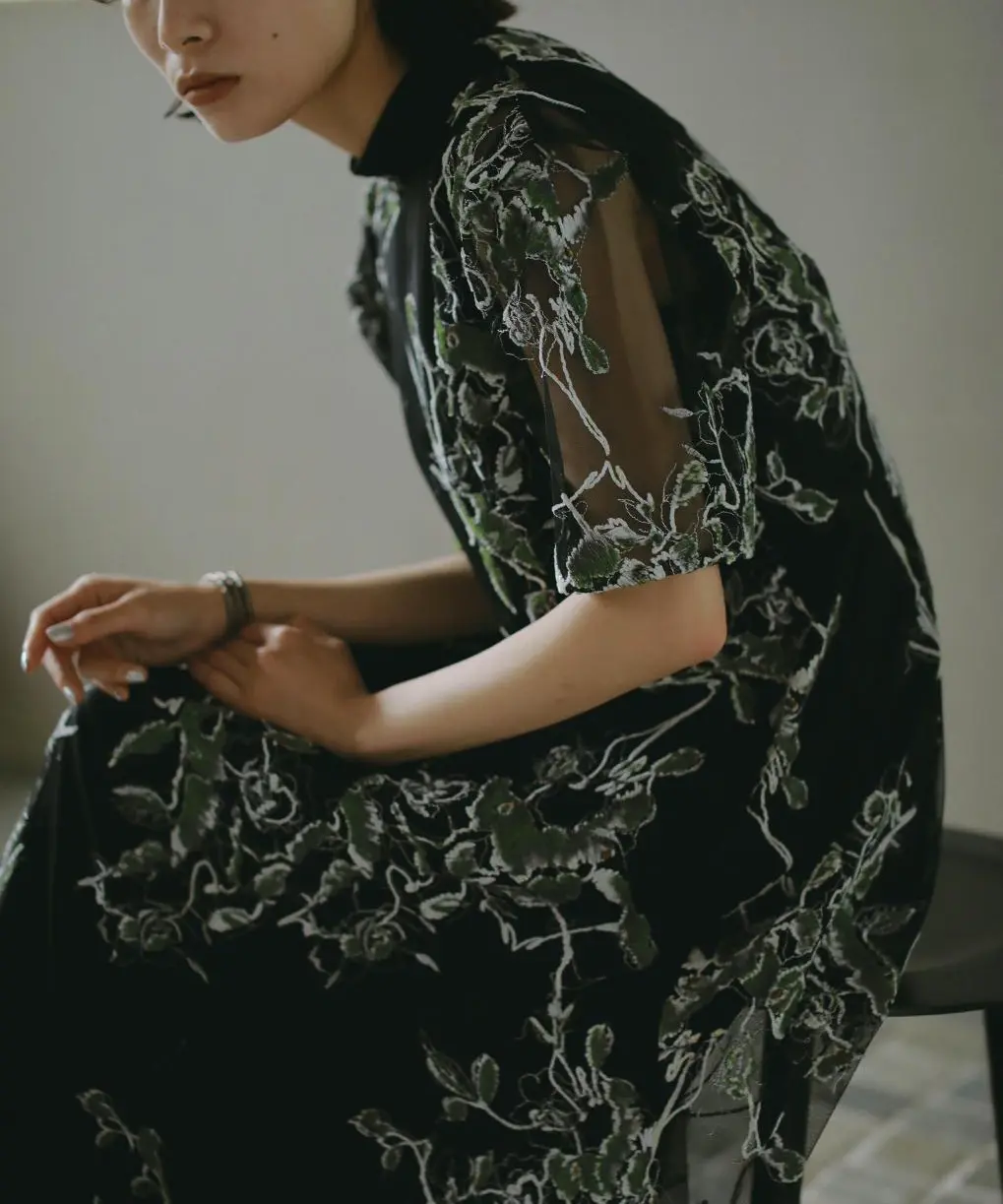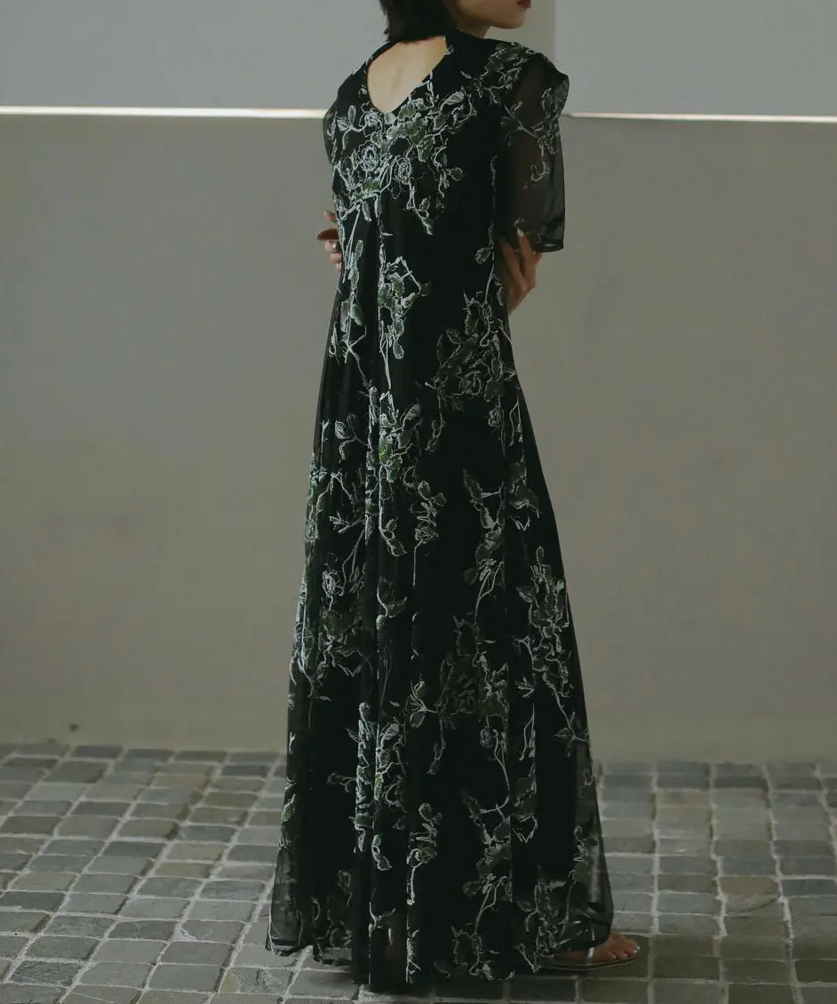花柄プリントを施したドレスで、袖があるため、幅広い季節にご着用いただけます。開き過ぎないバックオープンデザインで、上品な抜け感があります。また前後着用可能で、ハイネックとVネックで異なる雰囲気でご着用いただけます。またウエストマークされておりスタイルアップ効果があります。左脇のファスナーより着脱可能です。ストレッチのある素材を使用しているため、ストレスフリーでご着用いただけます。