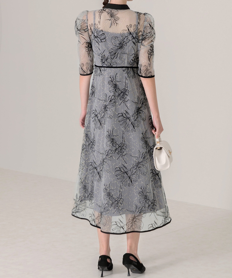 フラワー柄の刺繍が上品で、ゴールドのラメが動くために光りエレガントです。また切り替え位置が高めのため、スタイルアップ効果も抜群です。結婚式のお呼ばれなど華やかなシーンにピッタリのドレスです。