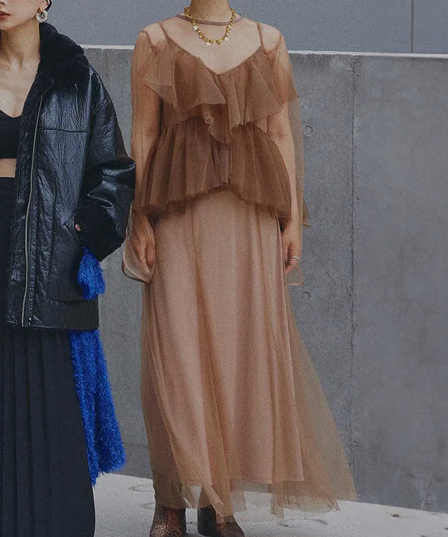 チュール素材をたっぷり使用したレイヤードドレスです。ドレスは程よいフィット&フレアで、肌心地も良いです。華やかなシーンにぴったりです。ペチワンピース付きで、透ける心配はございません。