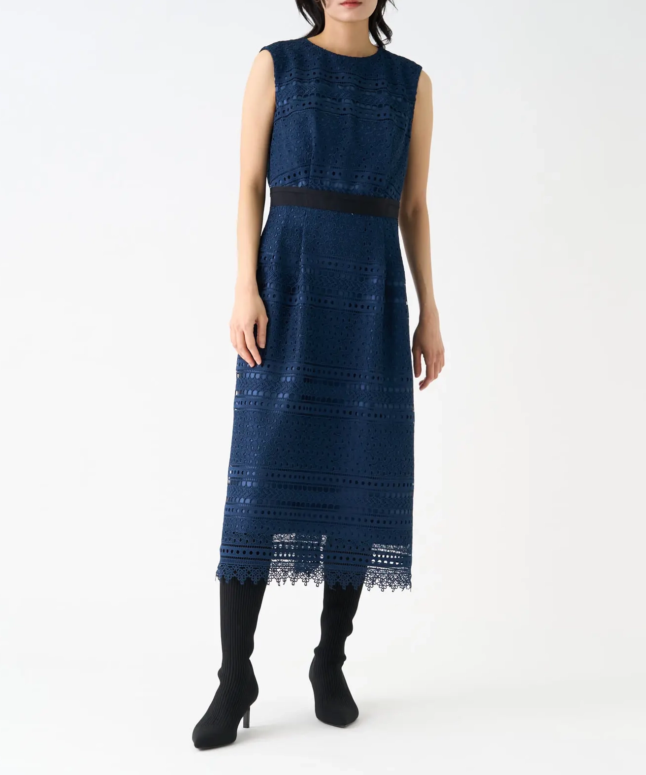 ドット、ウェーブ、フラワーの3種類のパターンをボーダー状に組み合わせた立体的な表情のワンピースは、すっきりとしたノースリーブとウエストのグログランテープがスタイリッシュさを加え、どんな羽織り物とも合わせやすく様々なテイストで楽しめます。