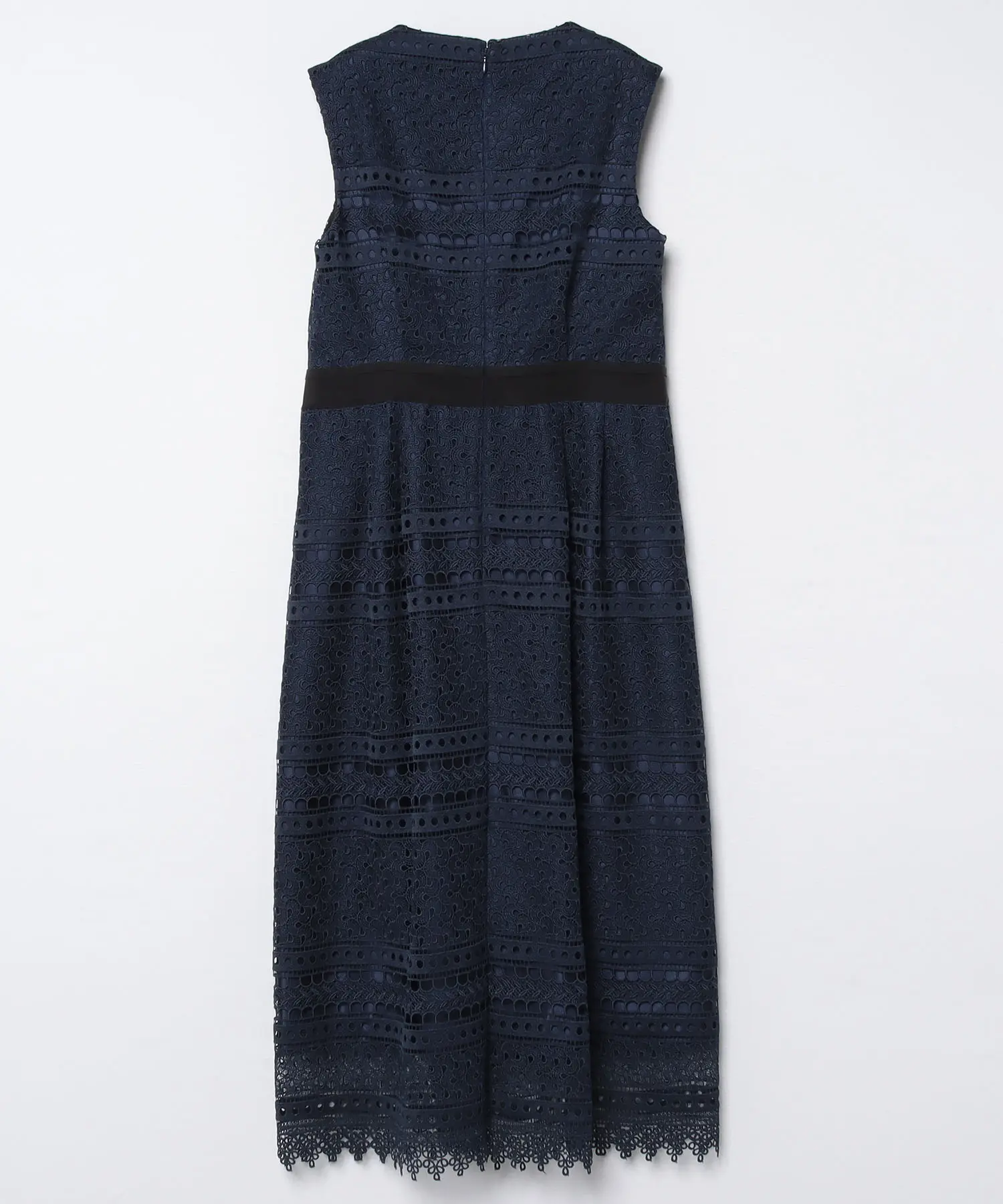 ドット、ウェーブ、フラワーの3種類のパターンをボーダー状に組み合わせた立体的な表情のワンピースは、すっきりとしたノースリーブとウエストのグログランテープがスタイリッシュさを加え、どんな羽織り物とも合わせやすく様々なテイストで楽しめます。