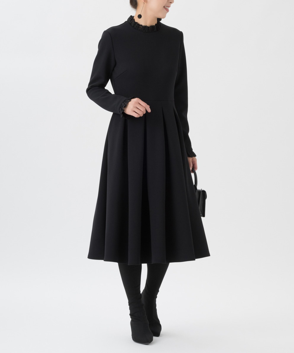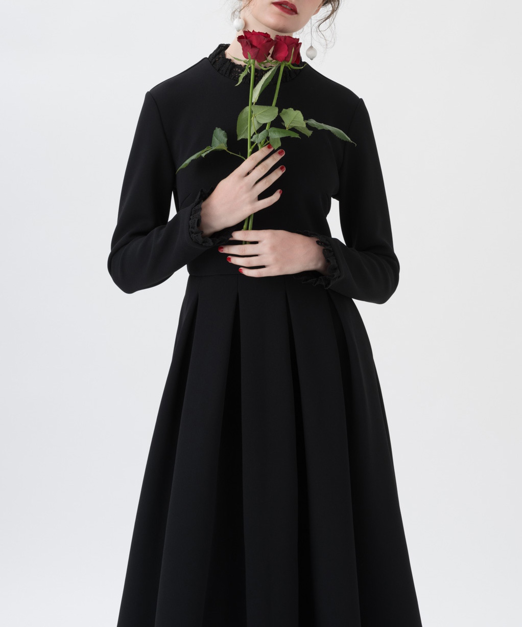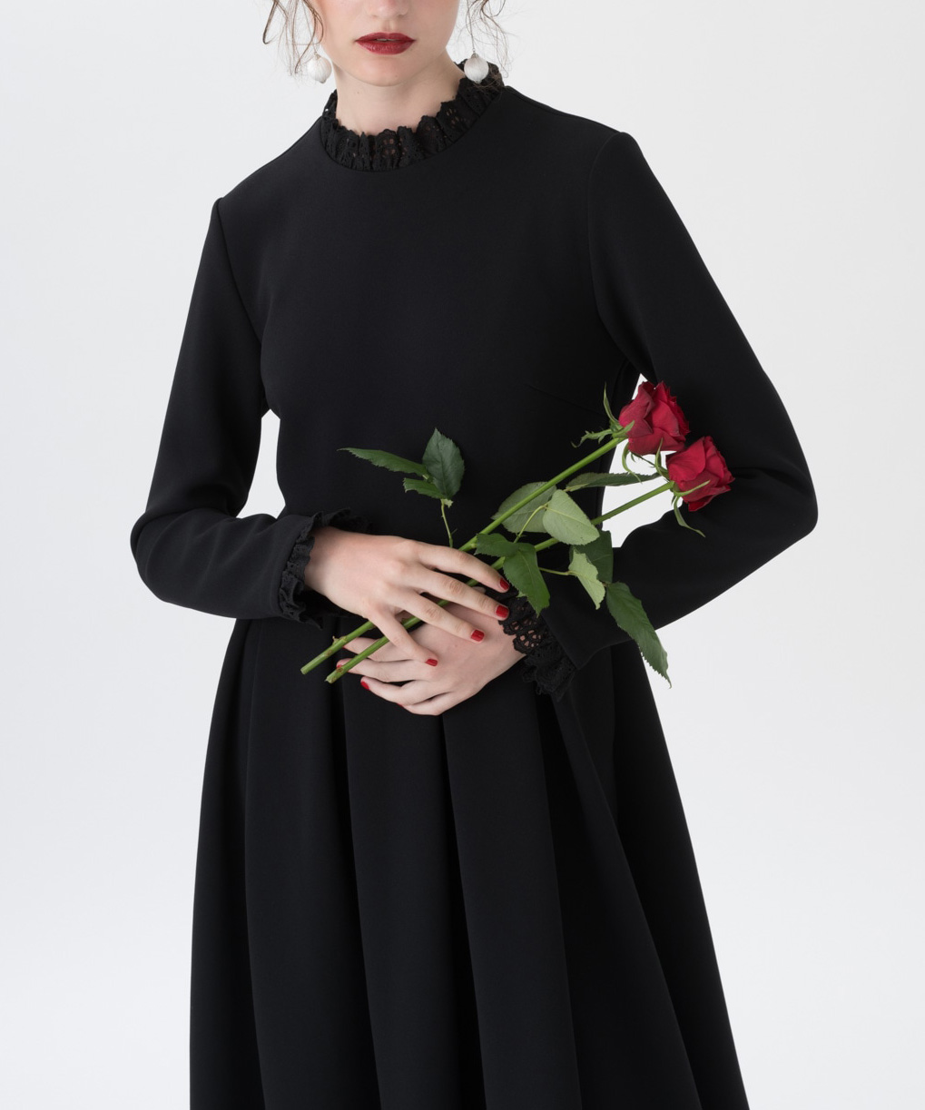 襟と袖に施されたレース使いがクラシカルで上品な華やかさを演出します。伸縮性があり快適な着心地のコンパクトな身頃や、シワになりにくいもっちりとした肉厚な生地が特徴です。