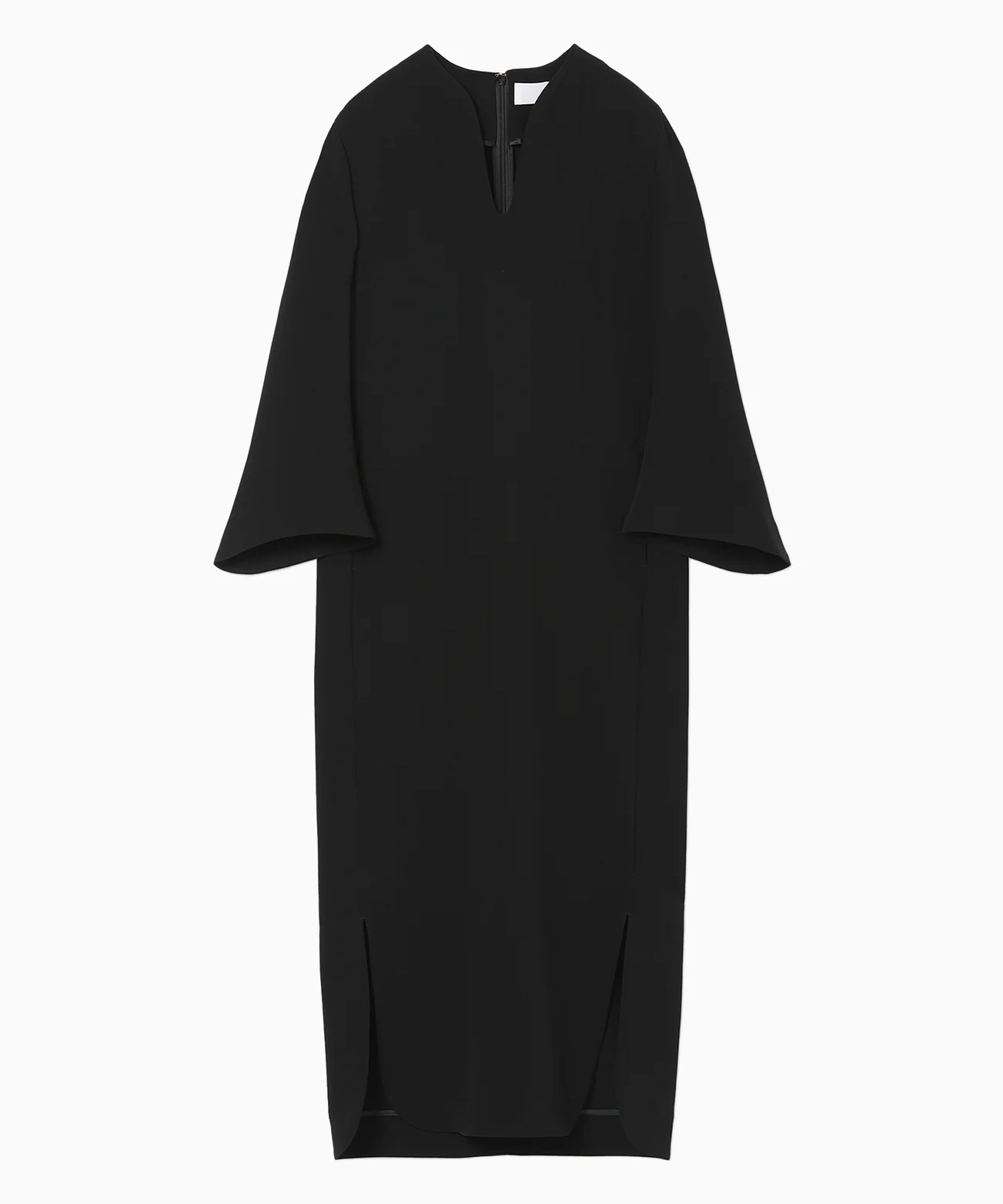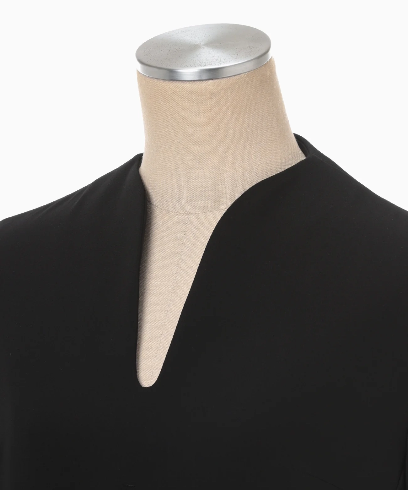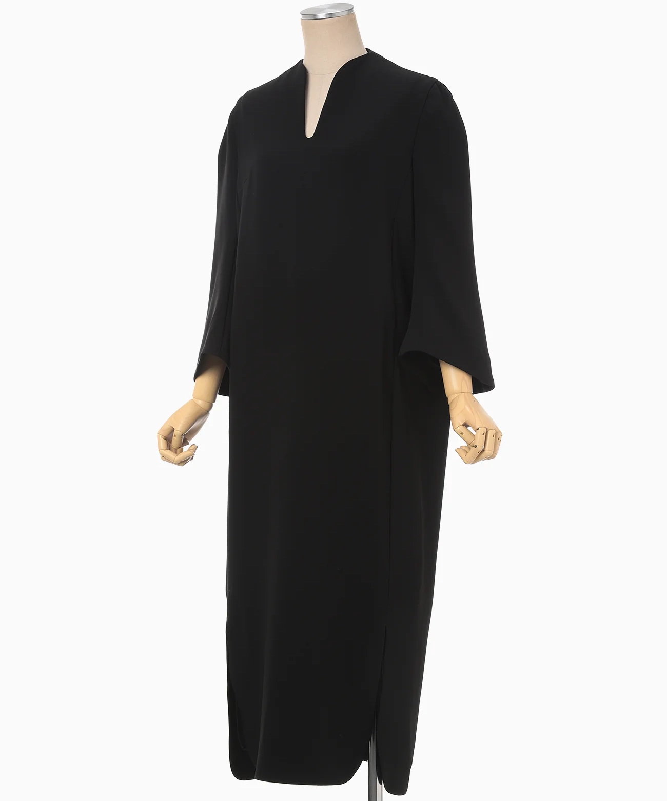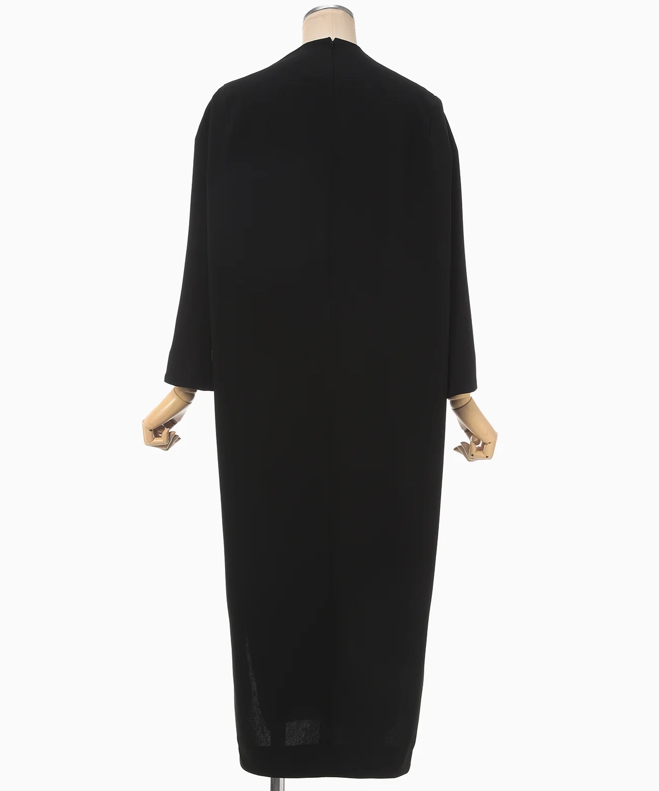 トリアセテートとポリエステルの特殊仮撚加工糸を使用したVネックドレスです。シルキータッチで豊かな膨らみのある生地がしっとりと仕上がり、ゆったりとした身頃と抜けのある襟元がレイヤードしやすいデザインとなっています。