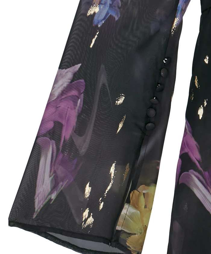 オリジナルのフラワーアート柄を使用したドレスで、生花をスキャンしてデザインしたこだわりの一着です。柔らかいシフォン素材にプリントされ、控えめで上品な印象を与えます。軽やかに揺れるドレスは女性らしく、ウエストを少し絞ったメリハリのあるシルエットとVネック仕様で抜け感を演出し、オケージョンシーンにも最適です。