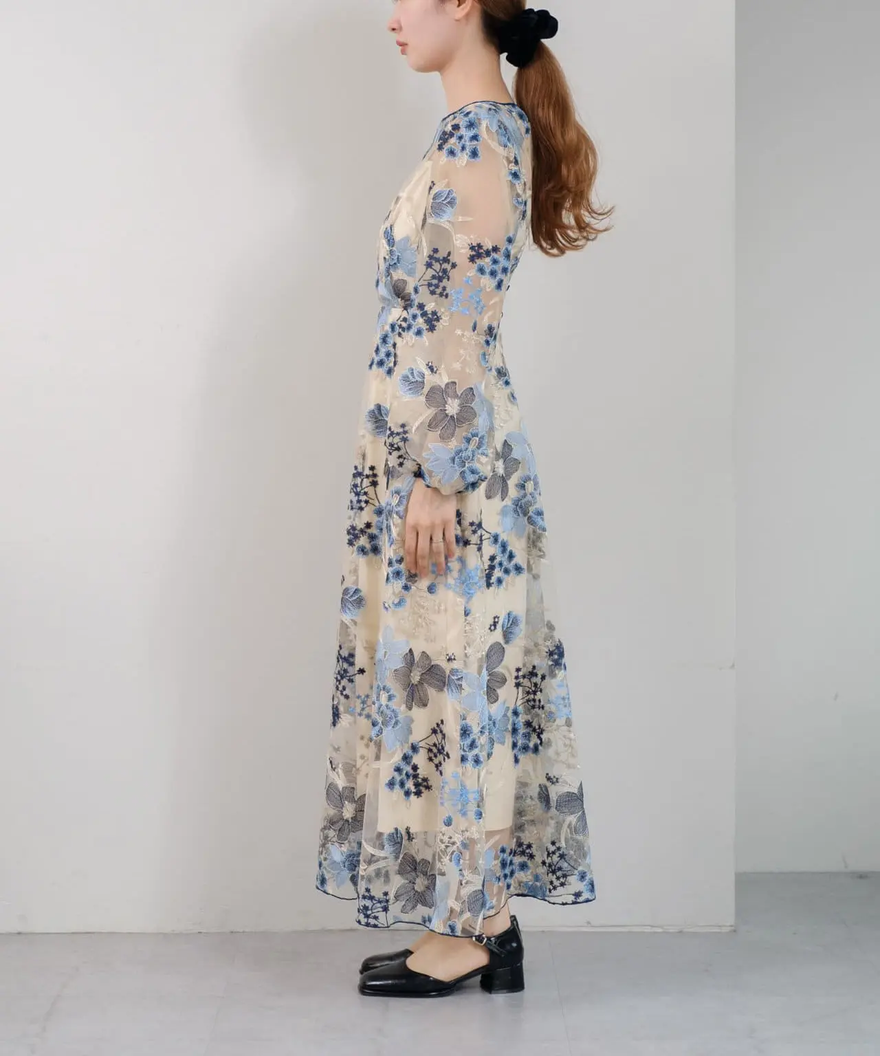 オーガンジー素材特有の軽やかで上品な透け感が、エレガントさを際立たせる一着です。THE URBAN BLANCHEのウェディングドレスのディティールを取り入れ、美しいシルエットを実現しているため、品格のあるスタイルがお好きな方には非常におすすめです。精巧な花柄刺繍が施されており、動きに合わせて光を受けて美しい陰影が生まれ、見る角度ごとに異なる表情が楽しめます。また、ウエストのギャザーが自然に体に沿い、Aラインシルエットがエレガントな雰囲気を強調します。厳選されたシーンにふさわしい、洗練された印象を与える一着です。