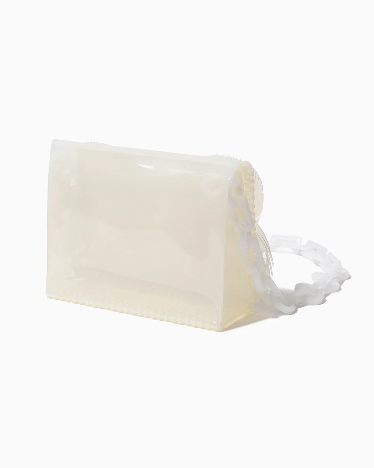 PVC素材の美しさを引き出し、Mame Kurogouchiのシグネチャーシリーズとして人気を集めています。デザイナーが幼少期の冬景色を重ねてデザインしたこのバッグは、裁断から組み立てまで職人の手作業によって作られており、ガラスのような繊細な輝きと氷柱を思わせる立体モチーフが特徴です。オリジナルのチェーン付きで斜めがけも可能なので、さまざまなシーンで華やかなアクセントとして活躍します。