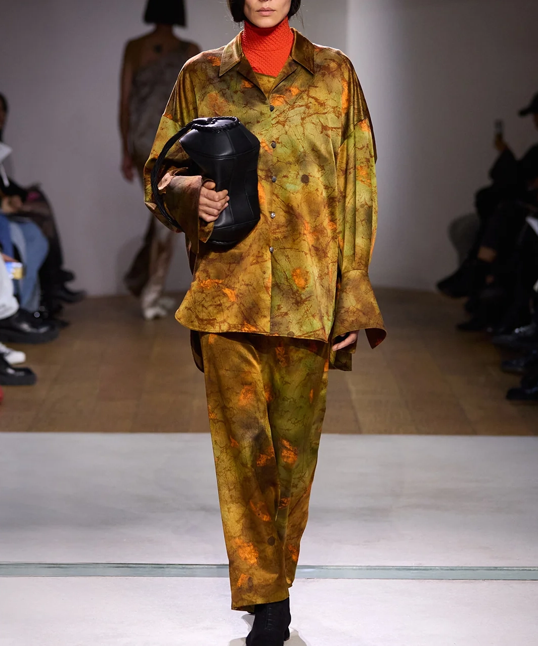 シンセティックレザーを使用したボストンバッグで、表面には樹脂コーティングを施したウルトラスウェードを採用。見た目は重厚感がありながらも、実際には軽くしなやかで、落ち着いた光沢と有機的なカーブが特徴です。いつものコーディネートに加えるだけで、コンテンポラリーで洗練された印象を引き立ててくれる一品です。