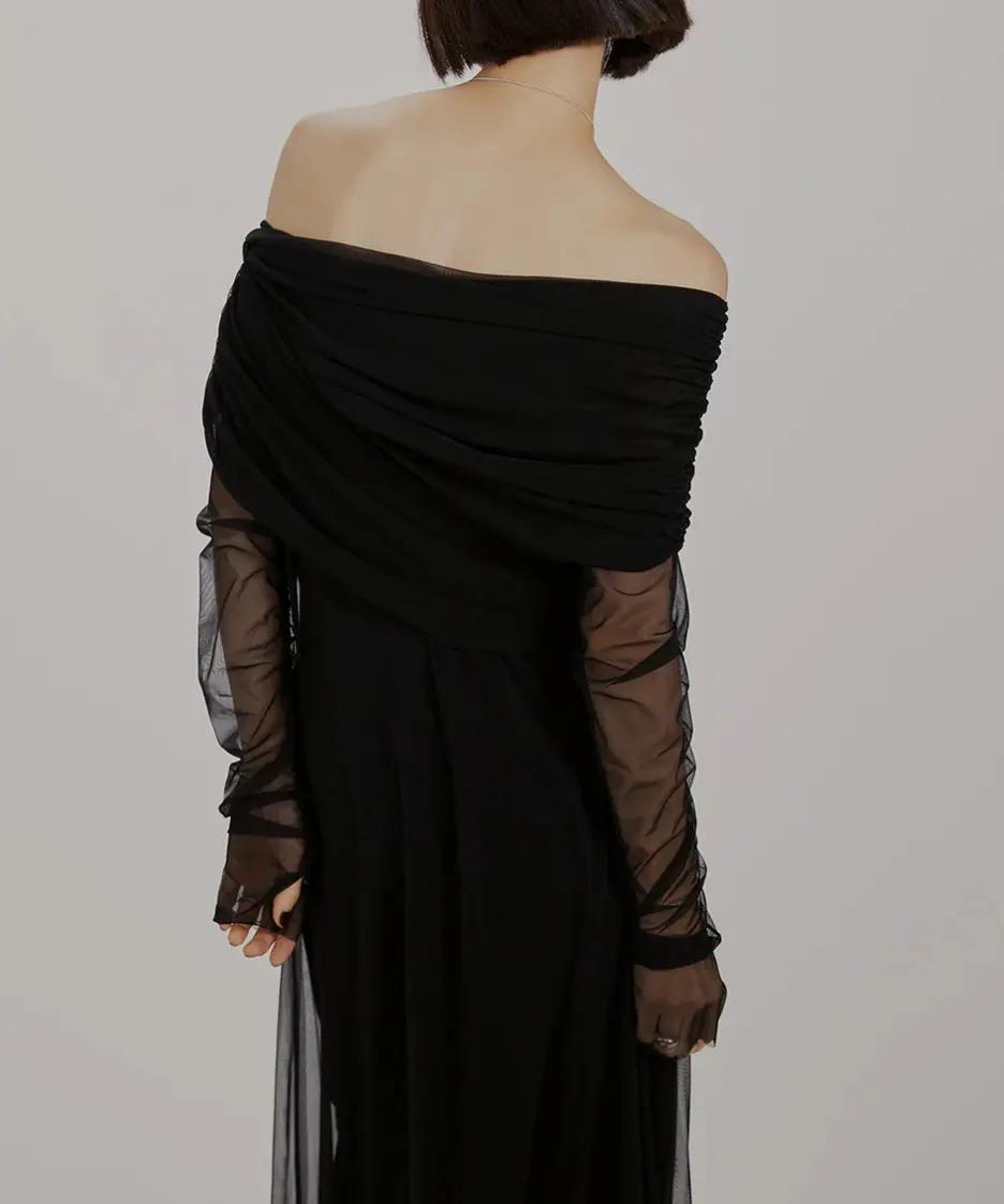 柔らかく細かいチュール素材とギャザーで、モードなデザインに。