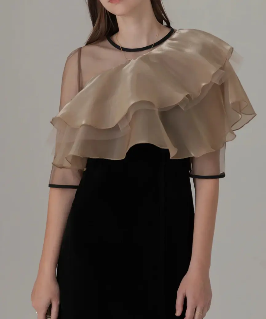 光沢感のあるオーガンジーとチュール素材のティアードフリルがエレガントさを引き立て、インナートップスなしで着るとワンショルダーの上品な肌見せが楽しめます。
