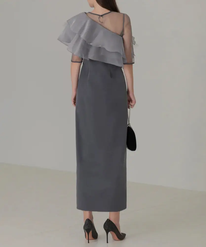 光沢感のあるオーガンジーとチュール素材のティアードフリルがエレガントさを引き立て、インナートップスなしで着るとワンショルダーの上品な肌見せが楽しめます。