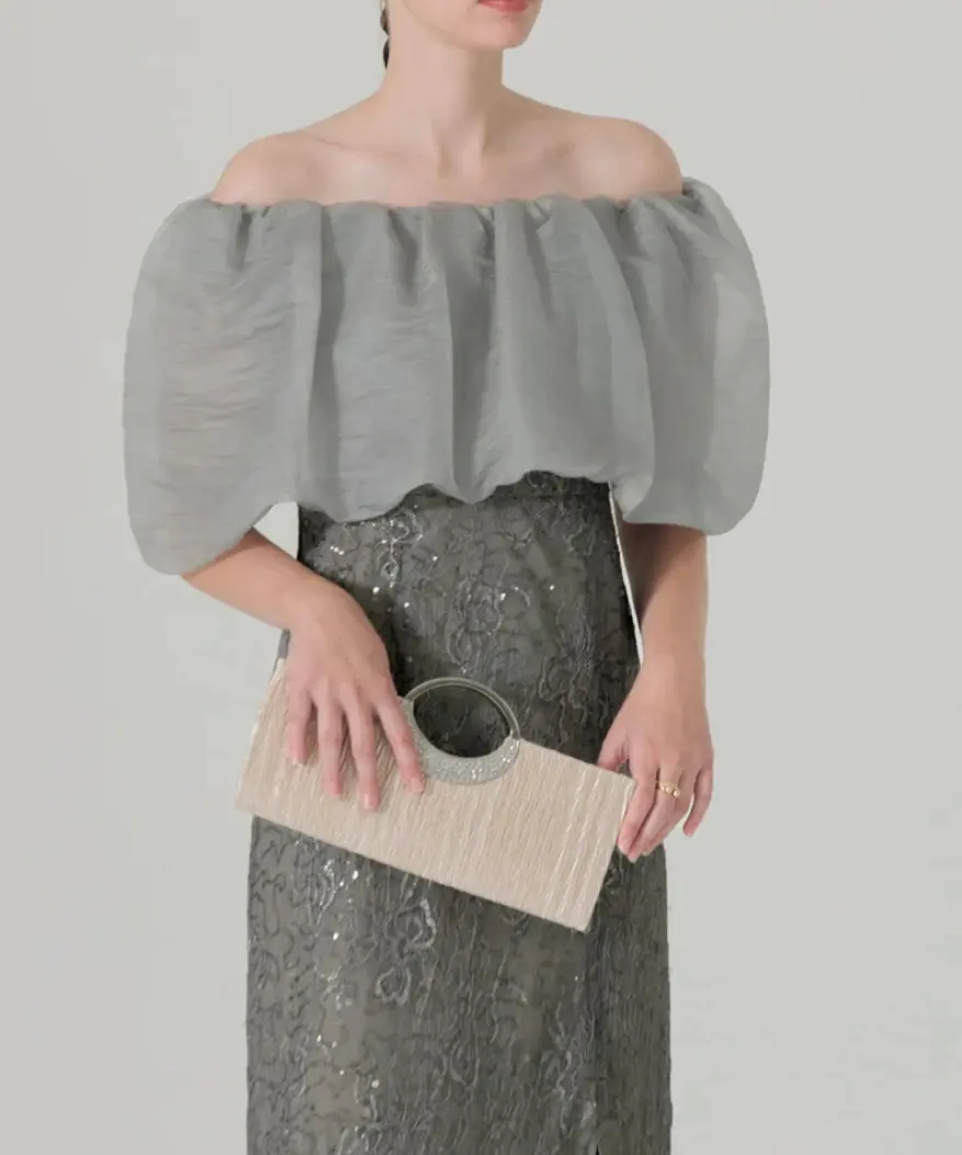 オフショルダーでデコルテを美しく見せ、パフスリーブで二の腕をカバーできる2WAY仕様のアイテムです。