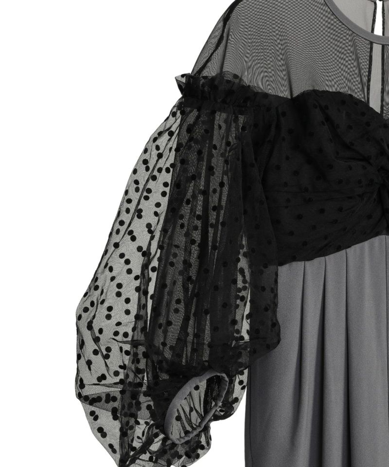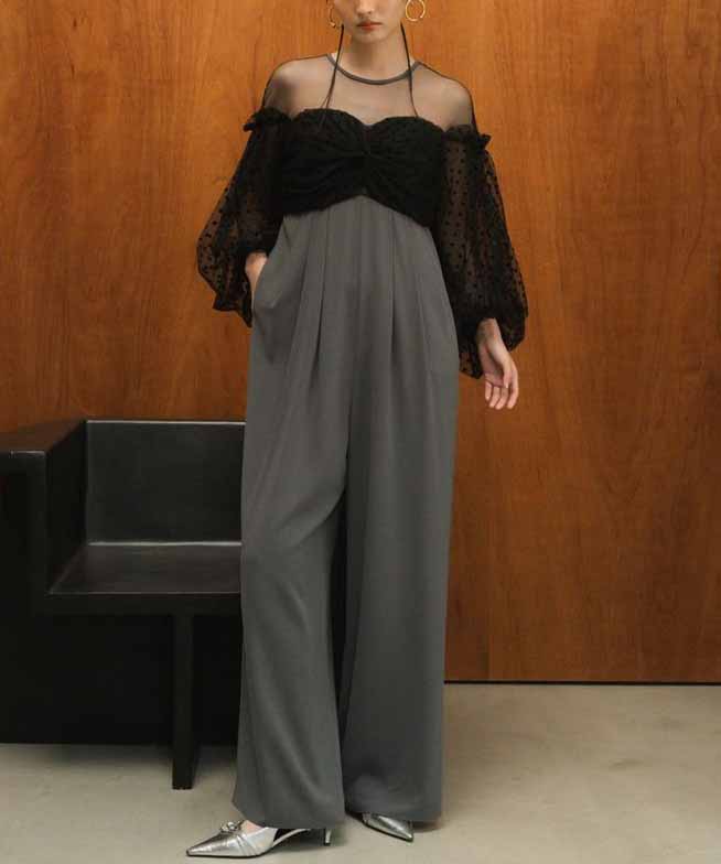 このドレスは、シアーなデコルテとフロッキードットの組み合わせが絶妙で、大人の甘さが程よく表現されています。バスト部分のチュール使いは繊細かつ立体的で、奥行きのあるデザインがとても印象的です。また、ジョーゼット生地のパンツ部分は落ち感が美しく、ワイドなシルエットがクールな印象をプラスしてくれます。袖のふわっとしたブラウジングデザインもポイントで、袖を通した瞬間に特別な気分になれる一着です。後ウエストがゴム仕様になっているので、リラックスした着心地でスタイルアップも叶うのが嬉しいです!