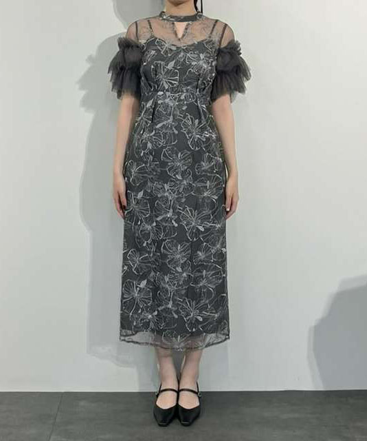 程よいハリと柔らかさのあるナイロンチュールを使用し、螺旋状のチュールフリルがボリュームたっぷりで華やかな印象です。裾に向かって細くなるペンシルラインのシルエットが女性らしさを引き立てるのはもちろん、ちびスタンドカラーがクラシカルな雰囲気を醸し出し、デコルテ部分のキーネック風カットが程よい抜け感を演出しています。さらに、ウエストに施されたタックディテールで体型を問わず着心地良く、スタイルアップ効果も期待できるドレスです。