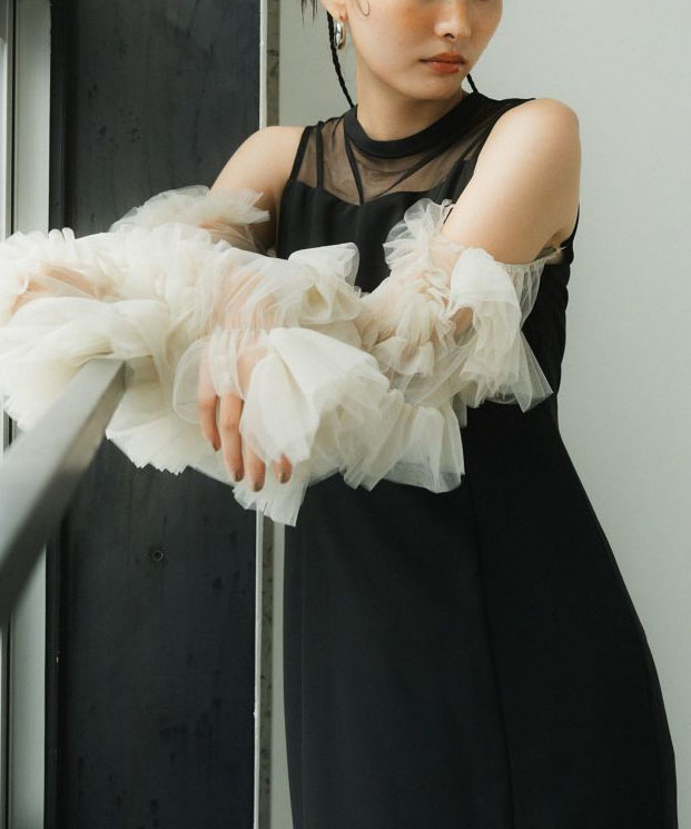 大胆なボリューム感が目を惹くチュールドレスは、柔らかな着心地と華やかさを両立した一枚です。シンプルなデザインのワンピースに対して、ボリュームスリーブのチュールが絶妙なバランスを演出。さらに、ドッキング仕様やアームカバーとしてのアレンジが可能で、デザイン性と実用性を兼ね備えています。