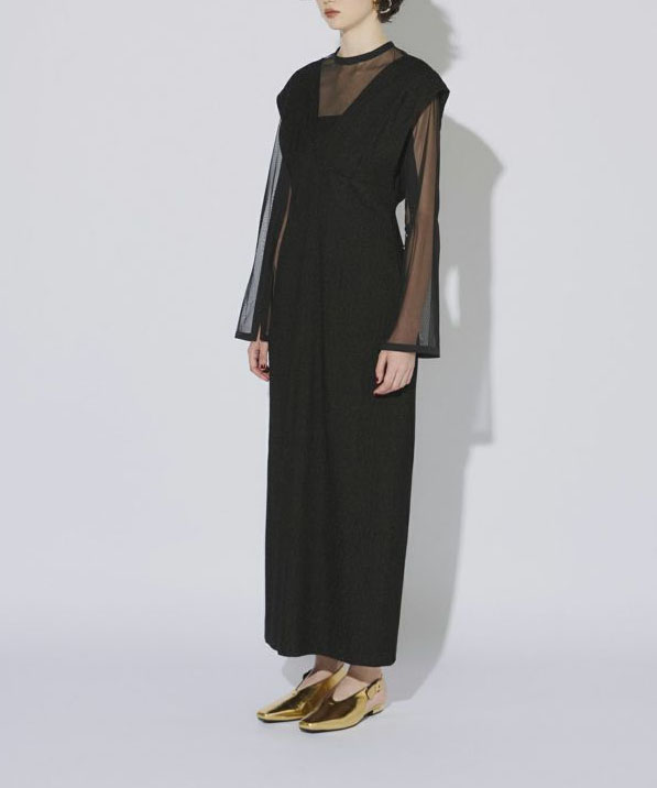 高級感あふれるジャガード素材のワンピースと、くるみボタンが施されたチュールインナーのセットは、それぞれ単品でも使える汎用性の高いアイテムです。ワンピースは深めのVネックと切替デザインでシャープかつスタイルアップを叶え、取り外し可能な胸当てで様々なシーンに対応可能。チュールインナーはスリットスリーブとしても活用でき、シーンに応じた多彩な着こなしが楽しめる魅力的なセットアップです。