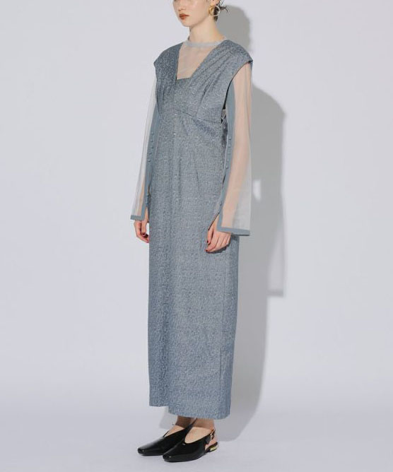 高級感あふれるジャガード素材のワンピースと、くるみボタンが施されたチュールインナーのセットは、それぞれ単品でも使える汎用性の高いアイテムです。ワンピースは深めのVネックと切替デザインでシャープかつスタイルアップを叶え、取り外し可能な胸当てで様々なシーンに対応可能。チュールインナーはスリットスリーブとしても活用でき、シーンに応じた多彩な着こなしが楽しめる魅力的なセットアップです。