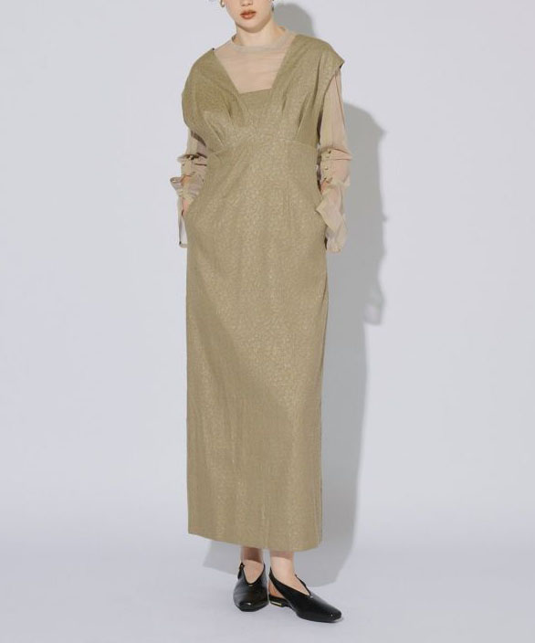 高級感あふれるジャガード素材のワンピースと、くるみボタンが施されたチュールインナーのセットは、それぞれ単品でも使える汎用性の高いアイテムです。ワンピースは深めのVネックと切替デザインでシャープかつスタイルアップを叶え、取り外し可能な胸当てで様々なシーンに対応可能。チュールインナーはスリットスリーブとしても活用でき、シーンに応じた多彩な着こなしが楽しめる魅力的なセットアップです。