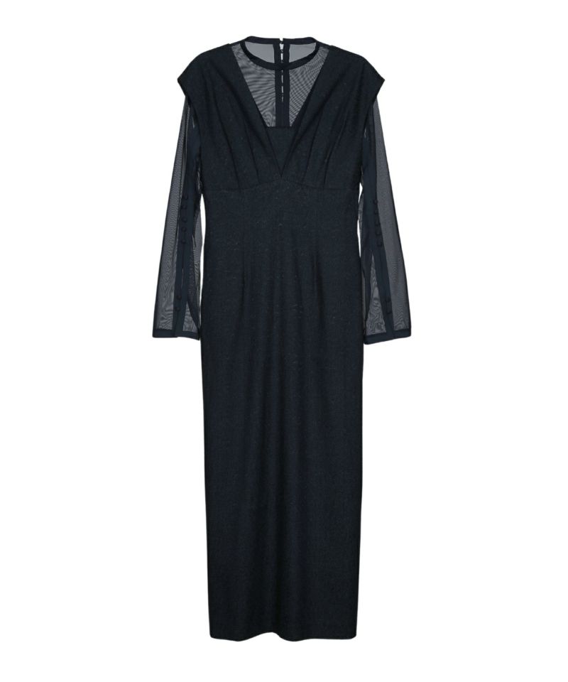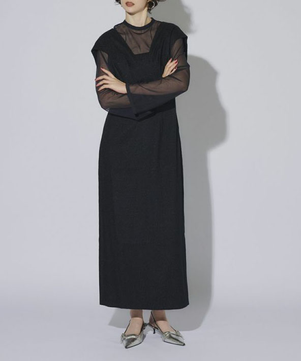 高級感あふれるジャガード素材のワンピースと、くるみボタンが施されたチュールインナーのセットは、それぞれ単品でも使える汎用性の高いアイテムです。ワンピースは深めのVネックと切替デザインでシャープかつスタイルアップを叶え、取り外し可能な胸当てで様々なシーンに対応可能。チュールインナーはスリットスリーブとしても活用でき、シーンに応じた多彩な着こなしが楽しめる魅力的なセットアップです。
