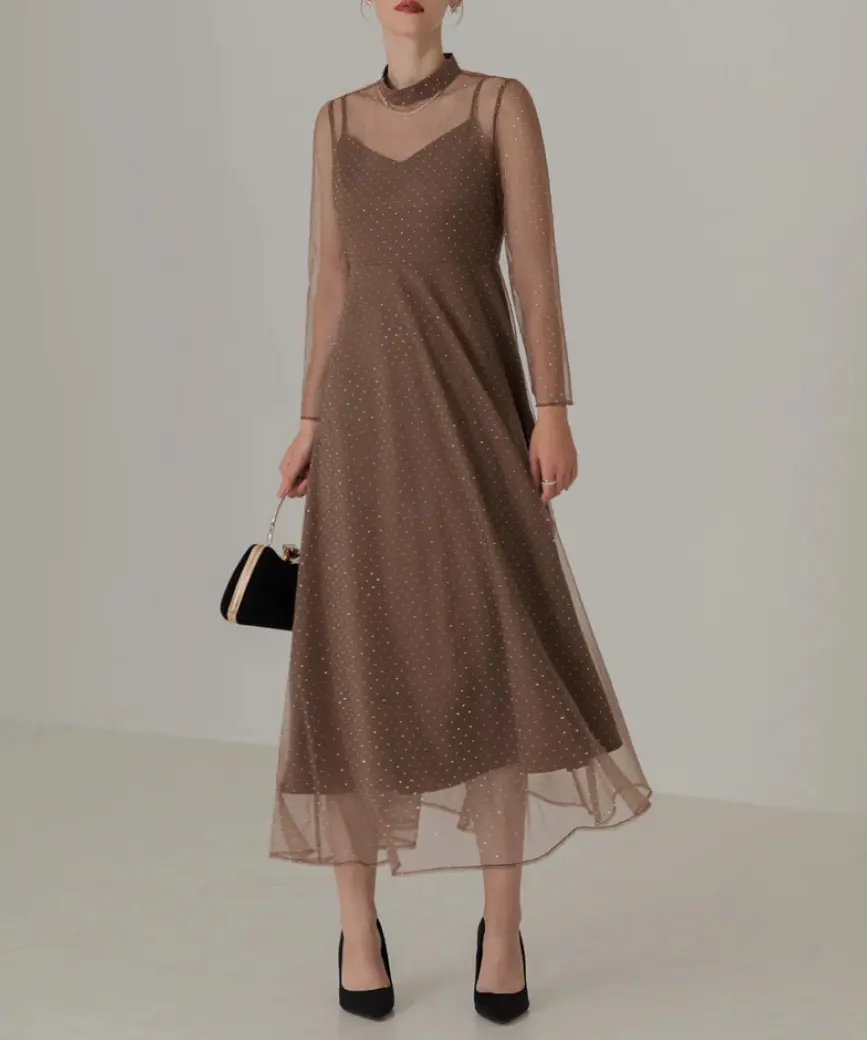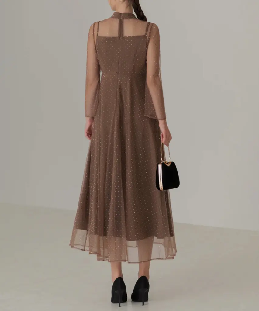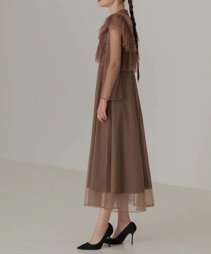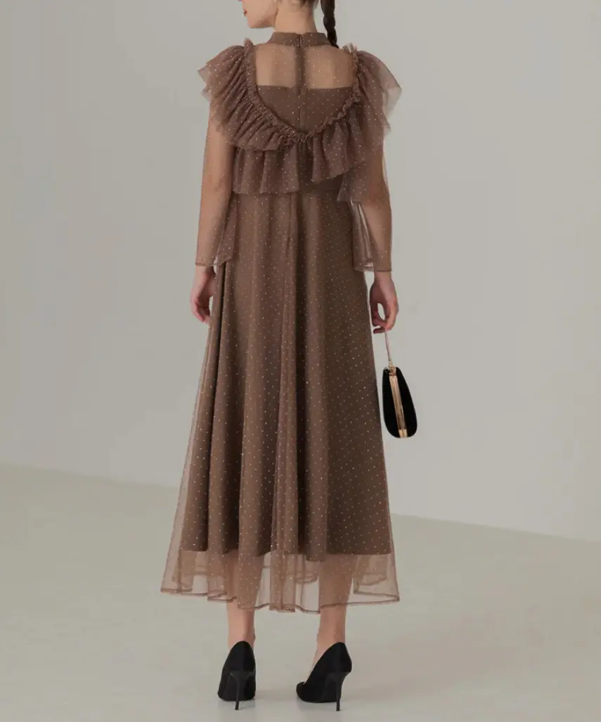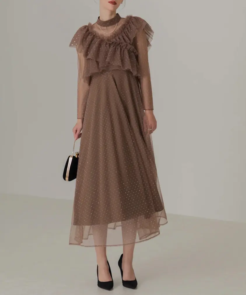 程よい透け感を持つ素材で抜け感と儚げな印象を与え、胸元のチュールギャザーは着脱可能でシンプルなワンピースとしても着用できます。