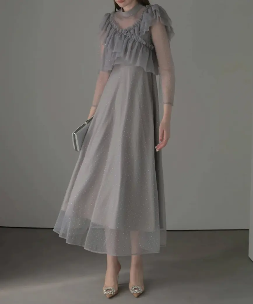 程よい透け感を持つ素材で抜け感と儚げな印象を与え、胸元のチュールギャザーは着脱可能でシンプルなワンピースとしても着用できます。