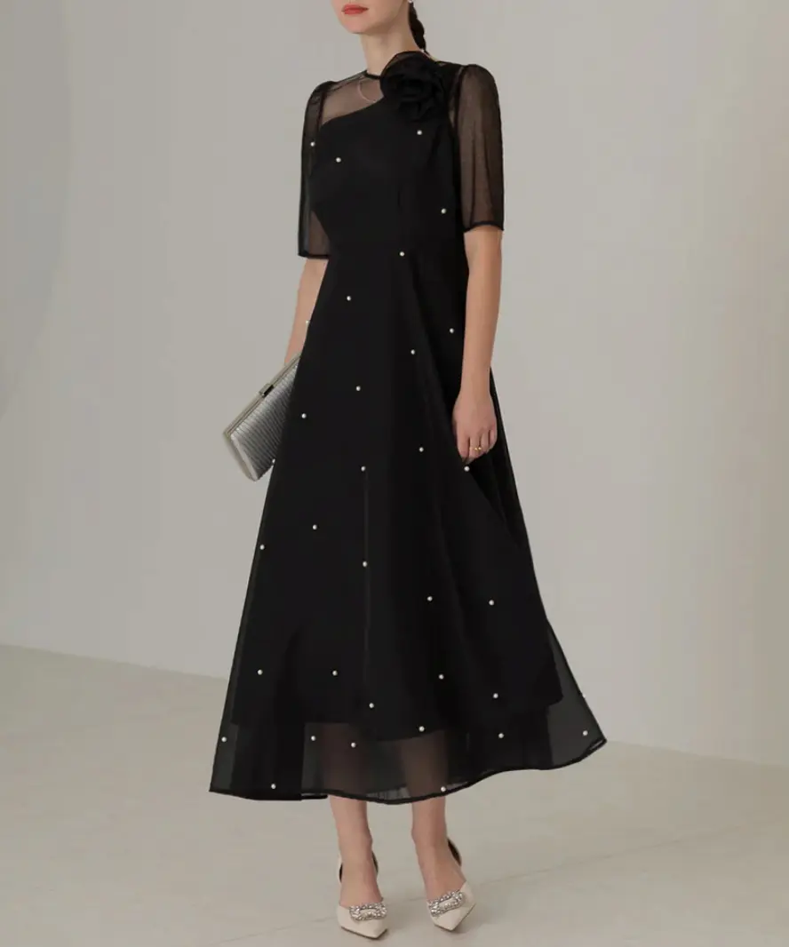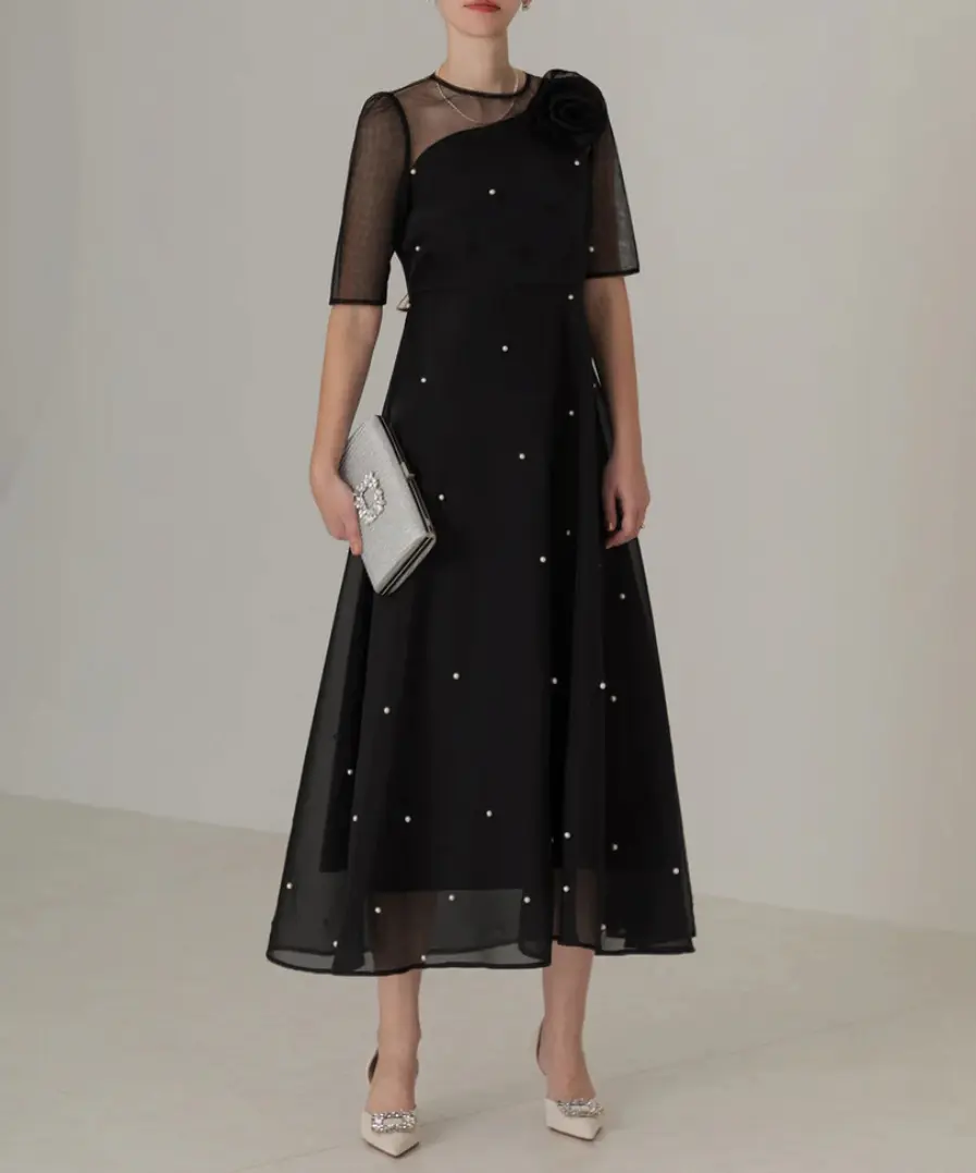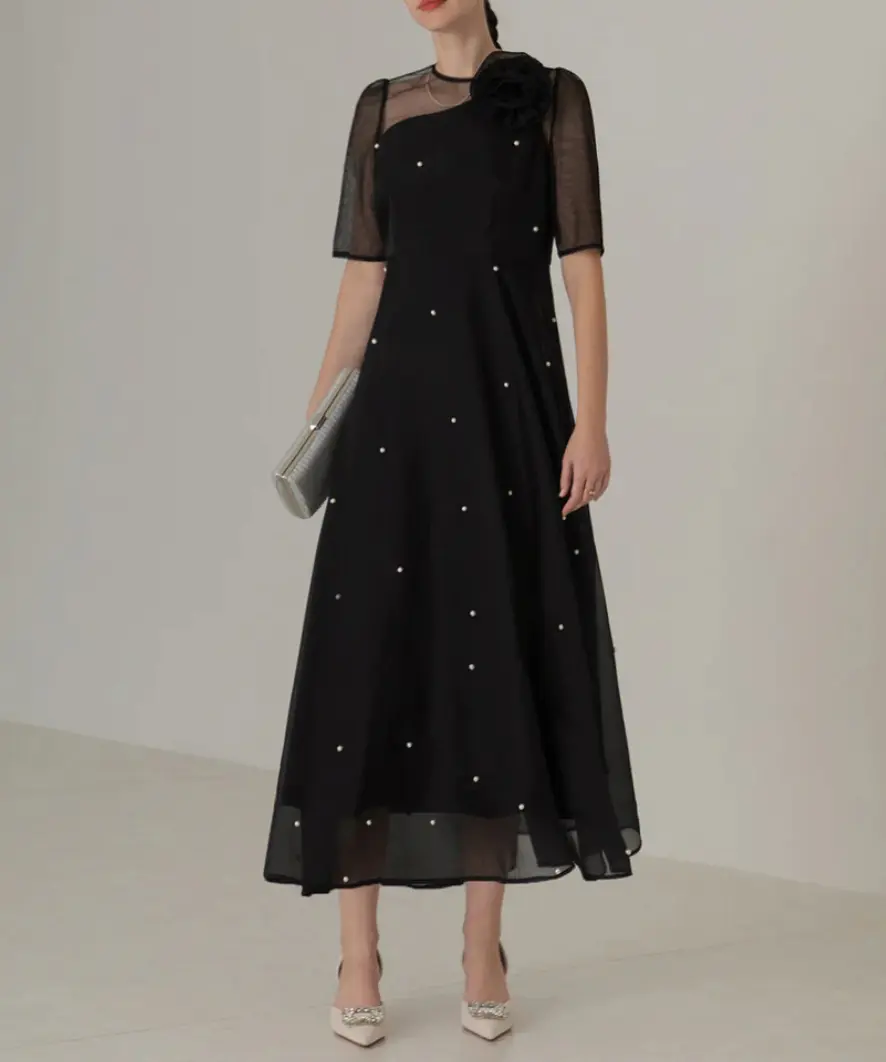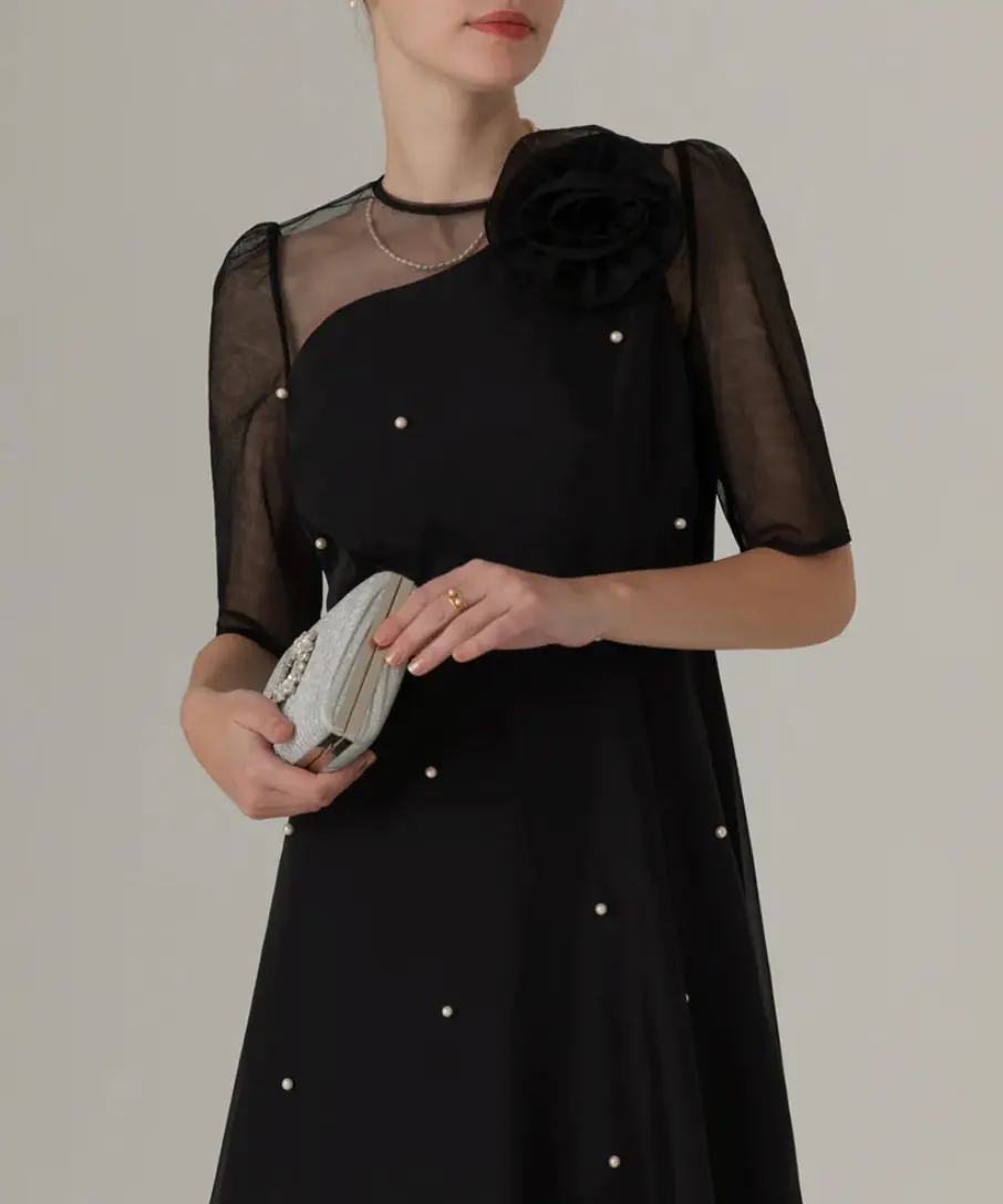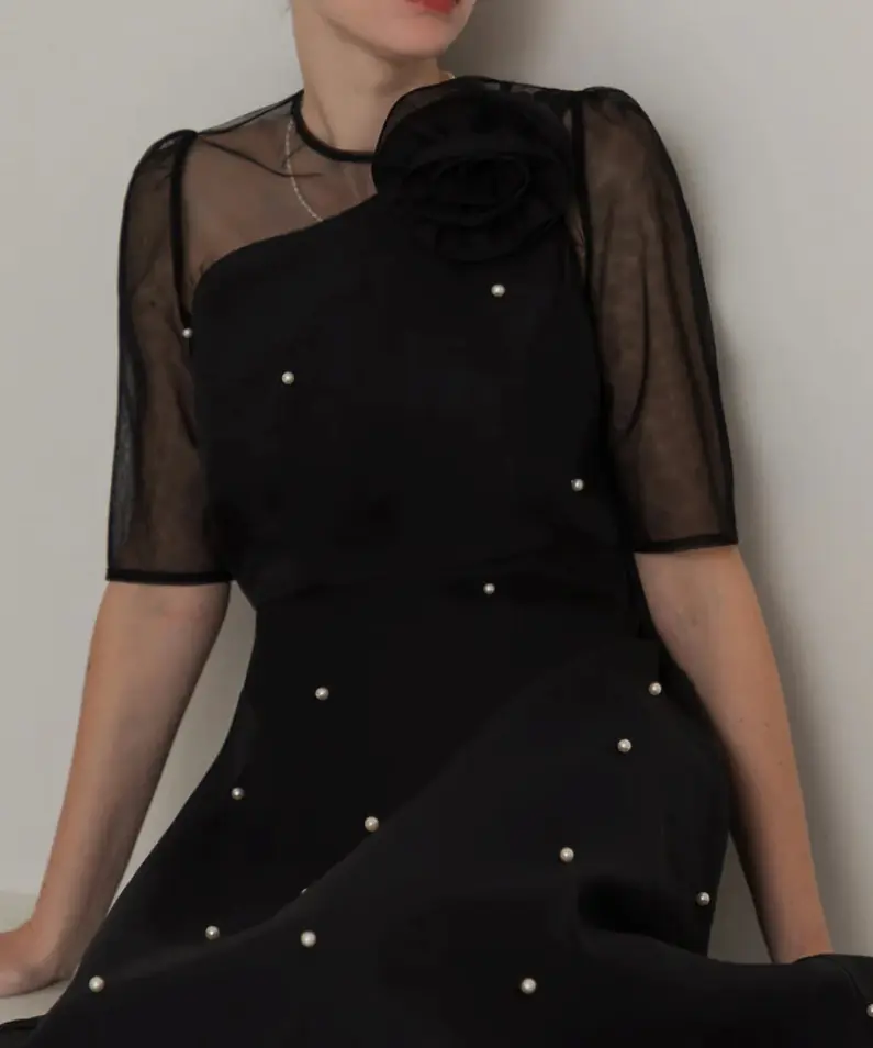 コサージュは取り外し可能となっており、ワンショルダー風のデザインが強調されモダンでスタイリッシュなスタイルに。