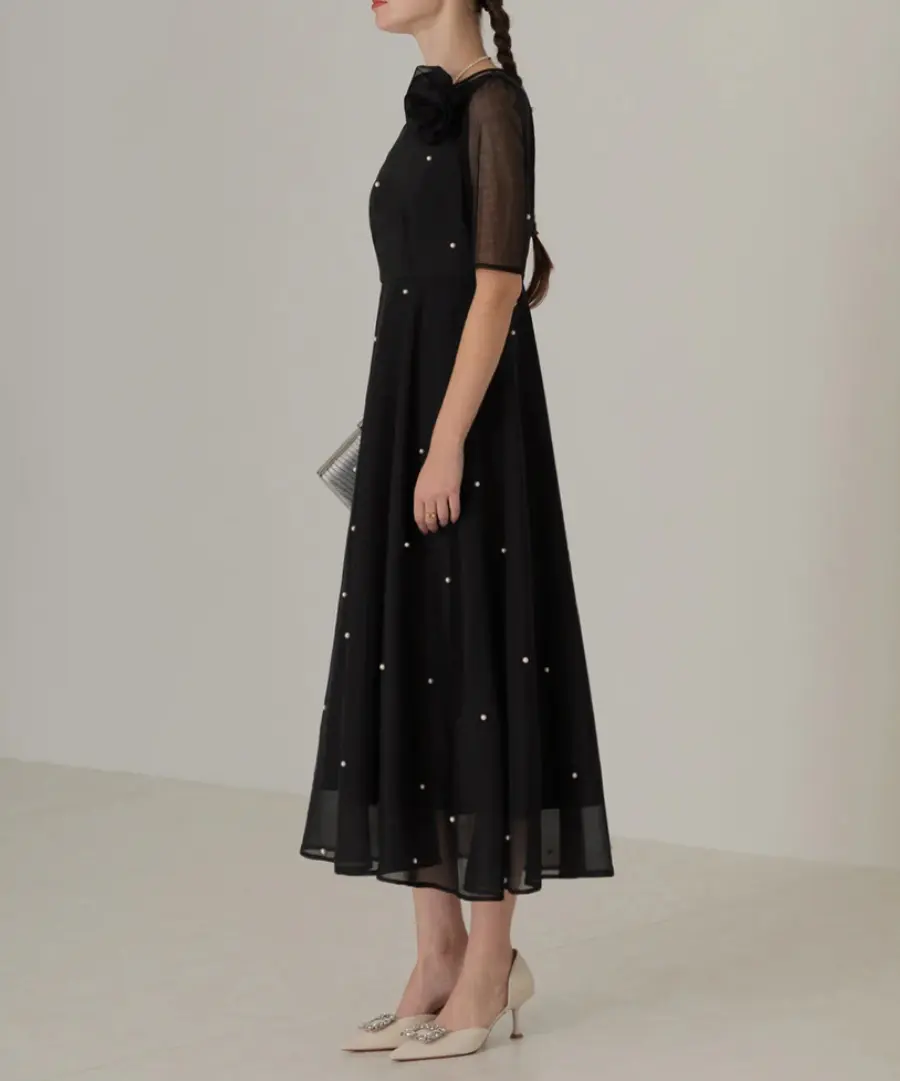 ふんだんに散りばめたパールとローズのモチーフが洗練された雰囲気を演出するAラインドレス。