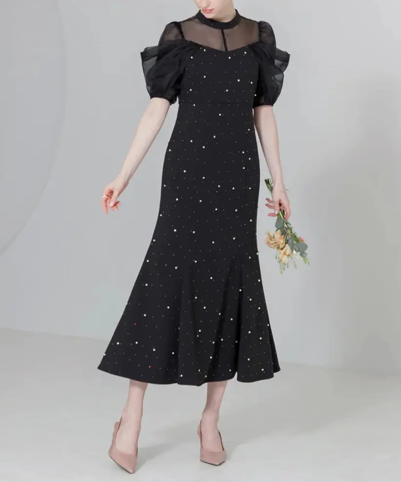 光輝くパールやビジューと上品な印象のパフスリーブを組み合わせたマーメイドドレス。