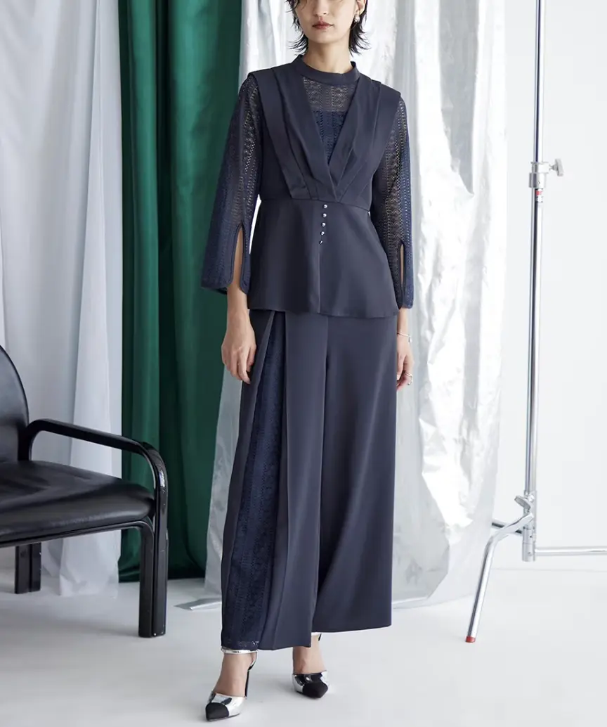 こちらのネイビーのドレスは、上品で洗練された印象を演出する1着でございます。落ち着いたカラーと絶妙なシルエットは、セレモニーやフォーマルなシーンにぴったりです。デザイン性がありながらも、控えめで気品あふれるスタイルは、結婚式やパーティーなど、さまざまな場面でご利用いただけます。