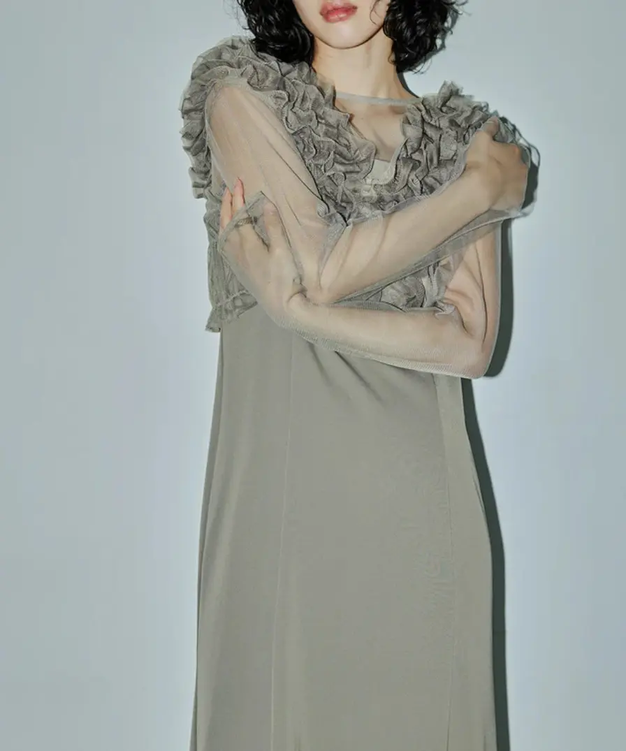 フリルを重ねたチュールベストが目を惹くデザインです。