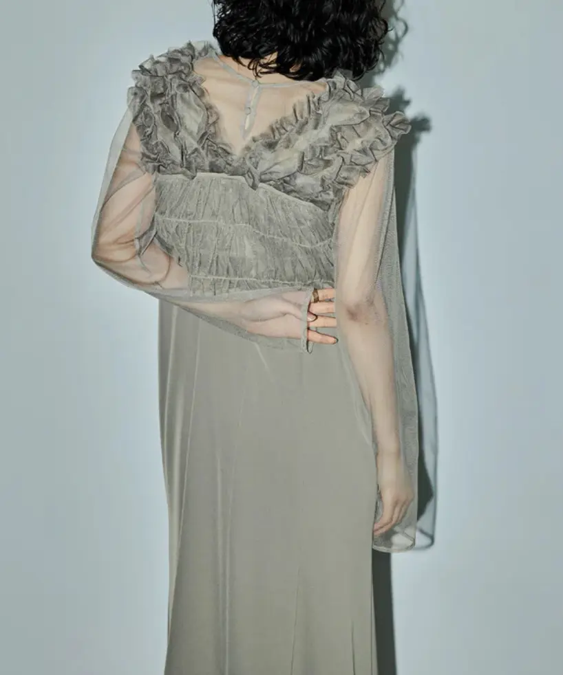 フリルを重ねたチュールベストが目を惹くデザインです。