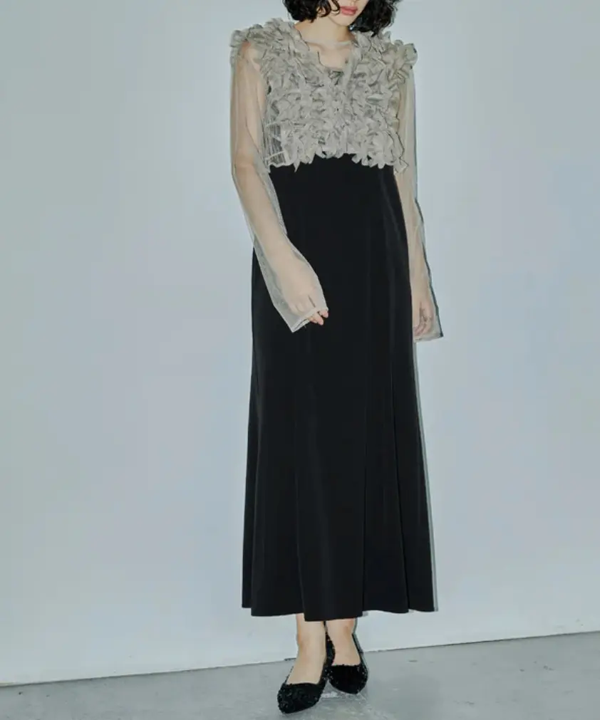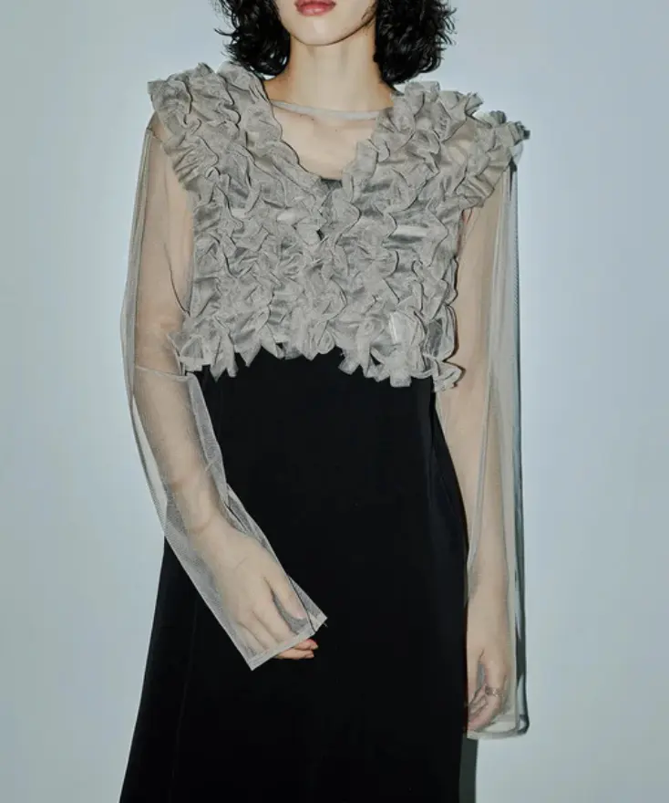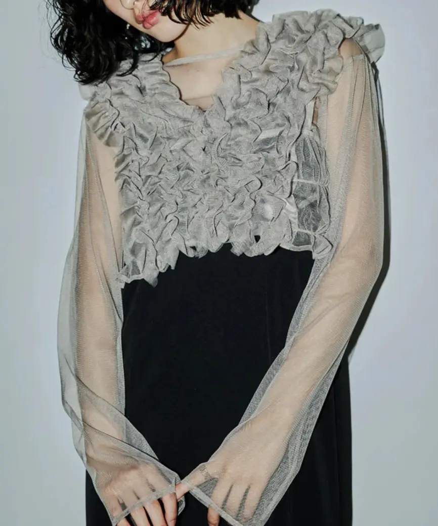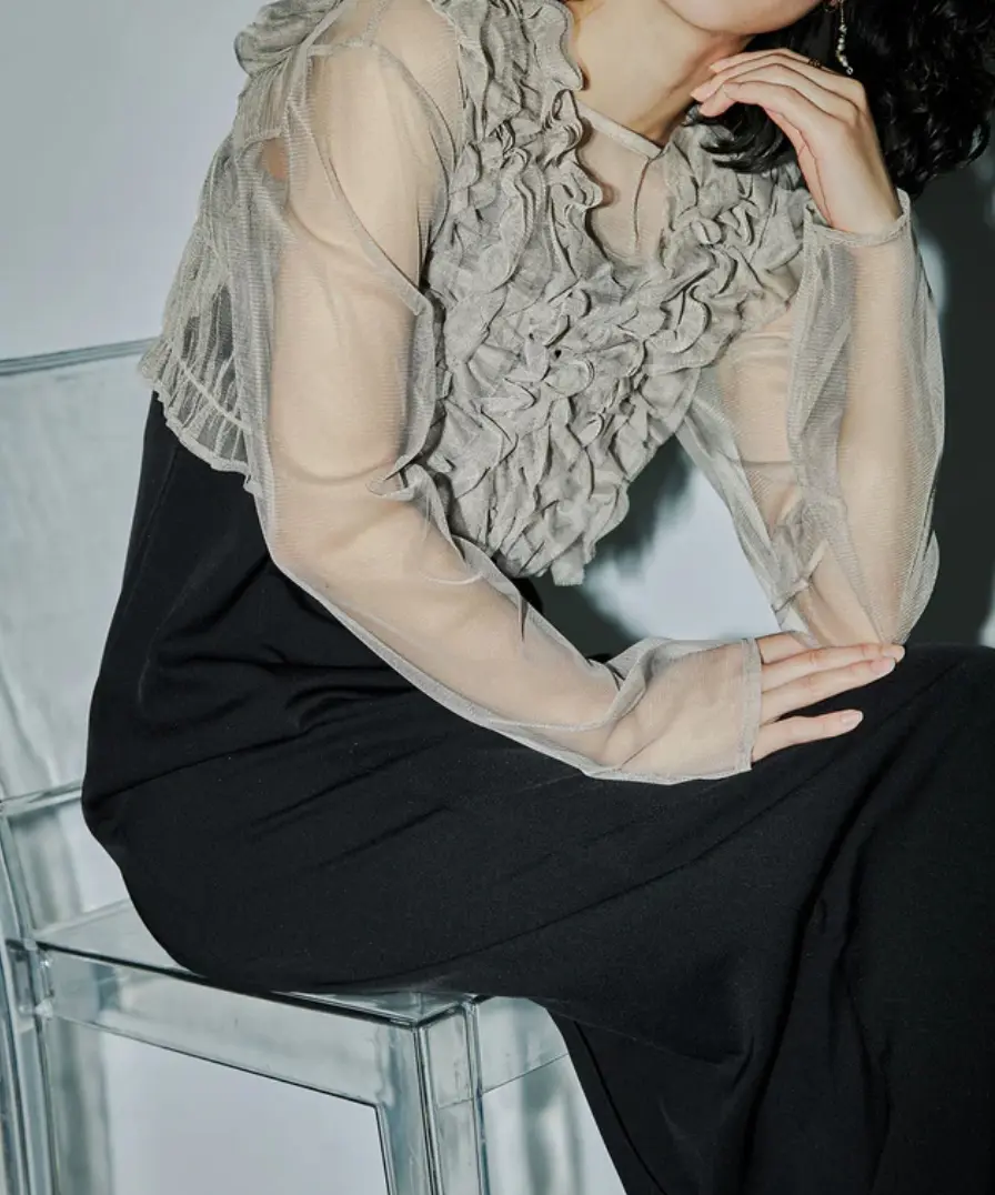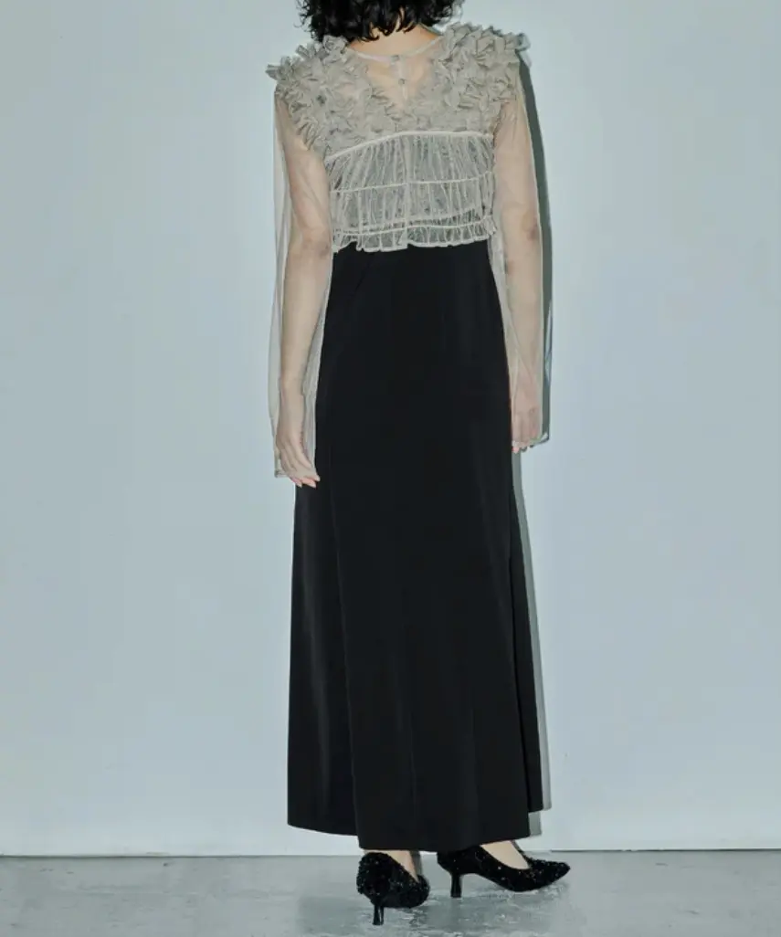 フリルを重ねたチュールベストが目を惹くデザインです。
