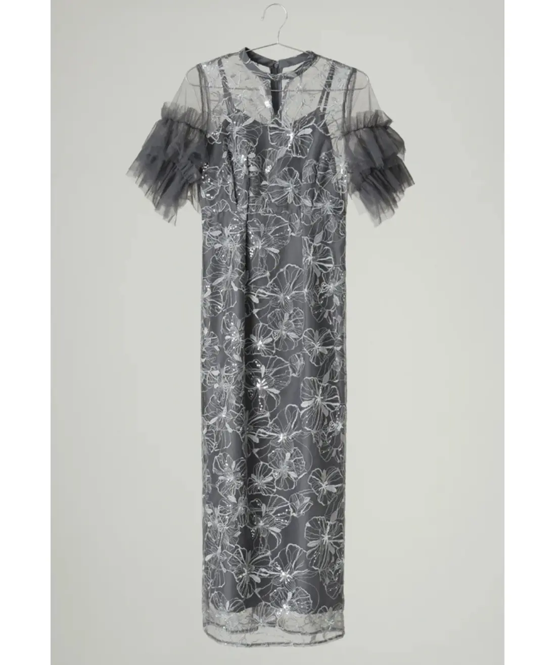 印象的な花柄の刺繍レースにきらきら煌めくスパンコールを散りばめたドレス。