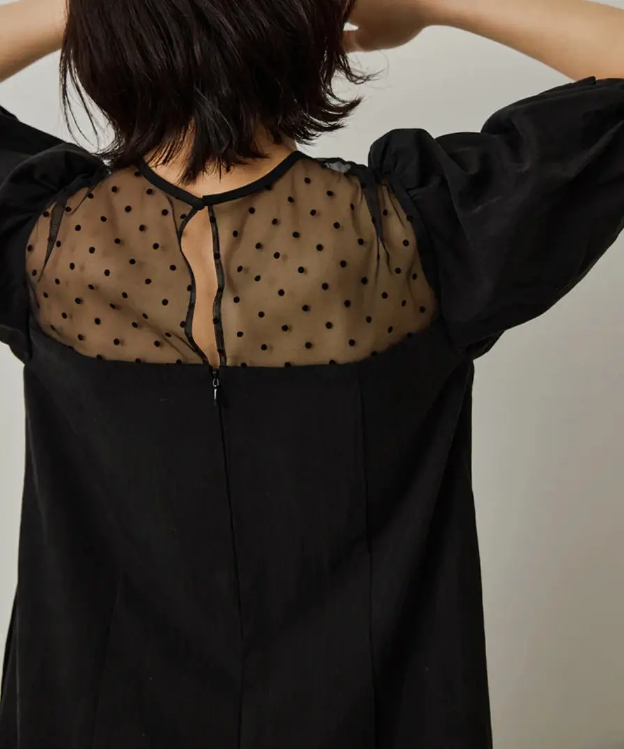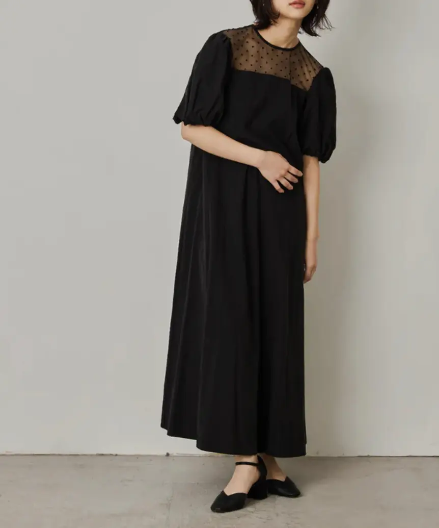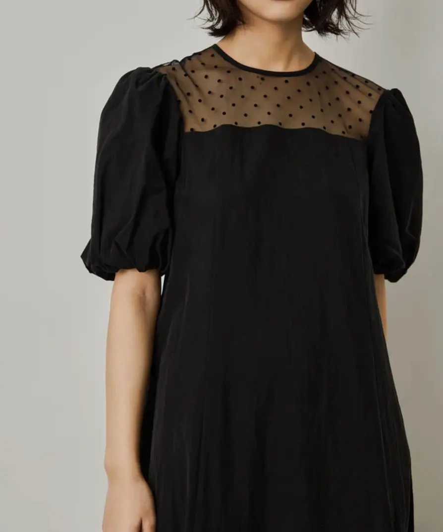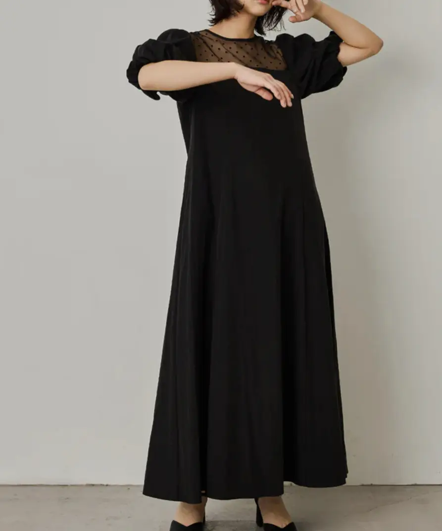 デコルテのチュールにドット柄が目を惹くAラインワンピース。