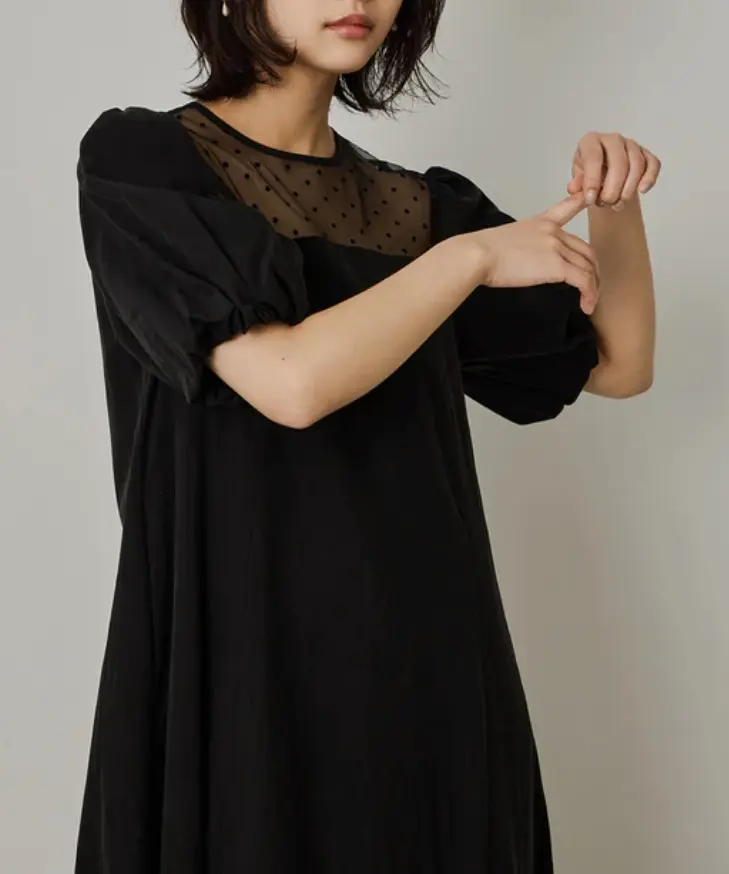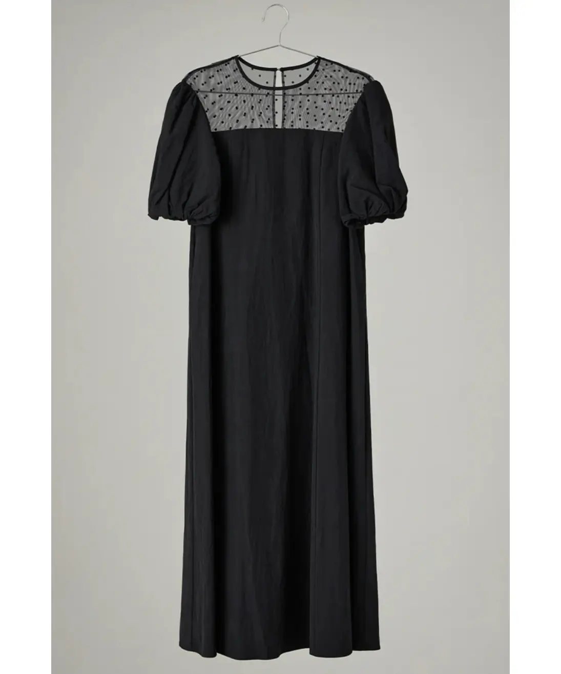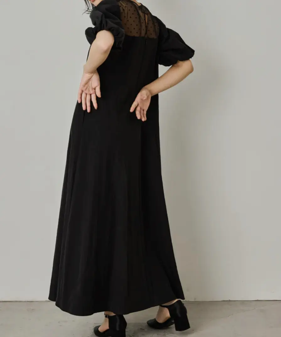 デコルテのチュールにドット柄が目を惹くAラインワンピース。