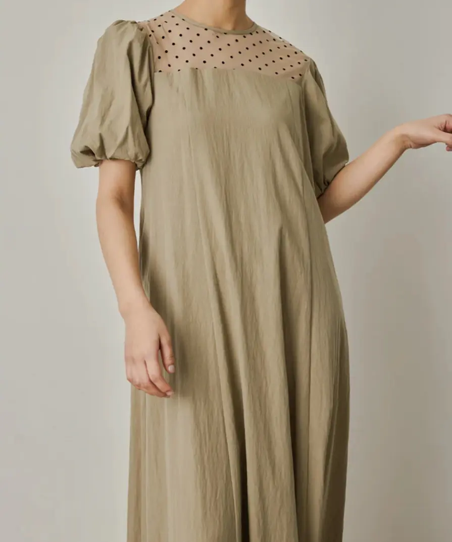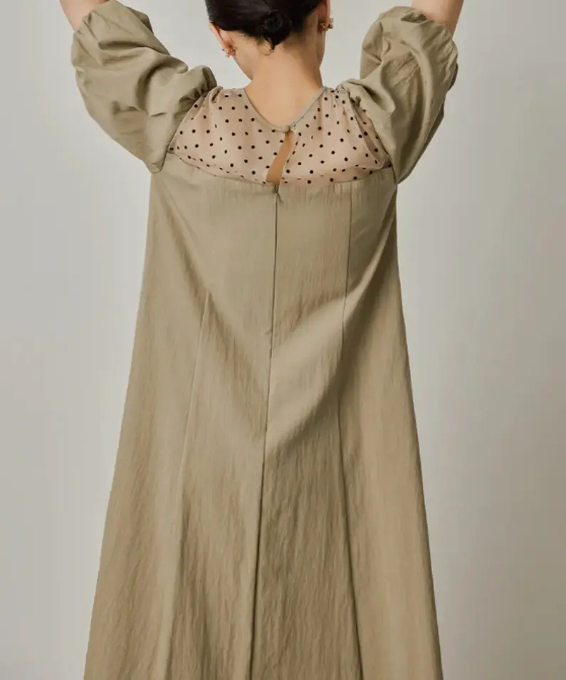 デコルテのチュールにドット柄が目を惹くAラインワンピース。