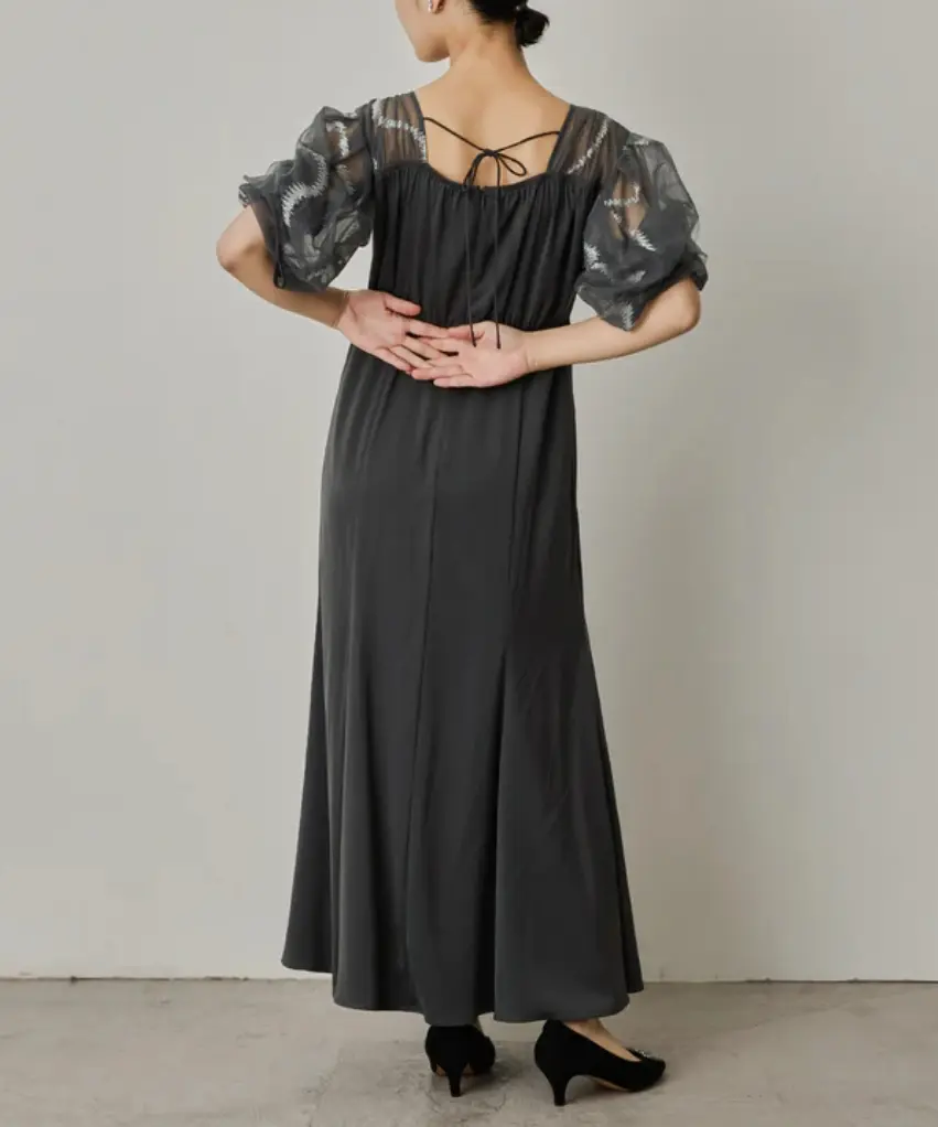柔らかなチュールにニュアンス感たっぷりのグラフィティ柄の刺繍を施したスリーブドレス。