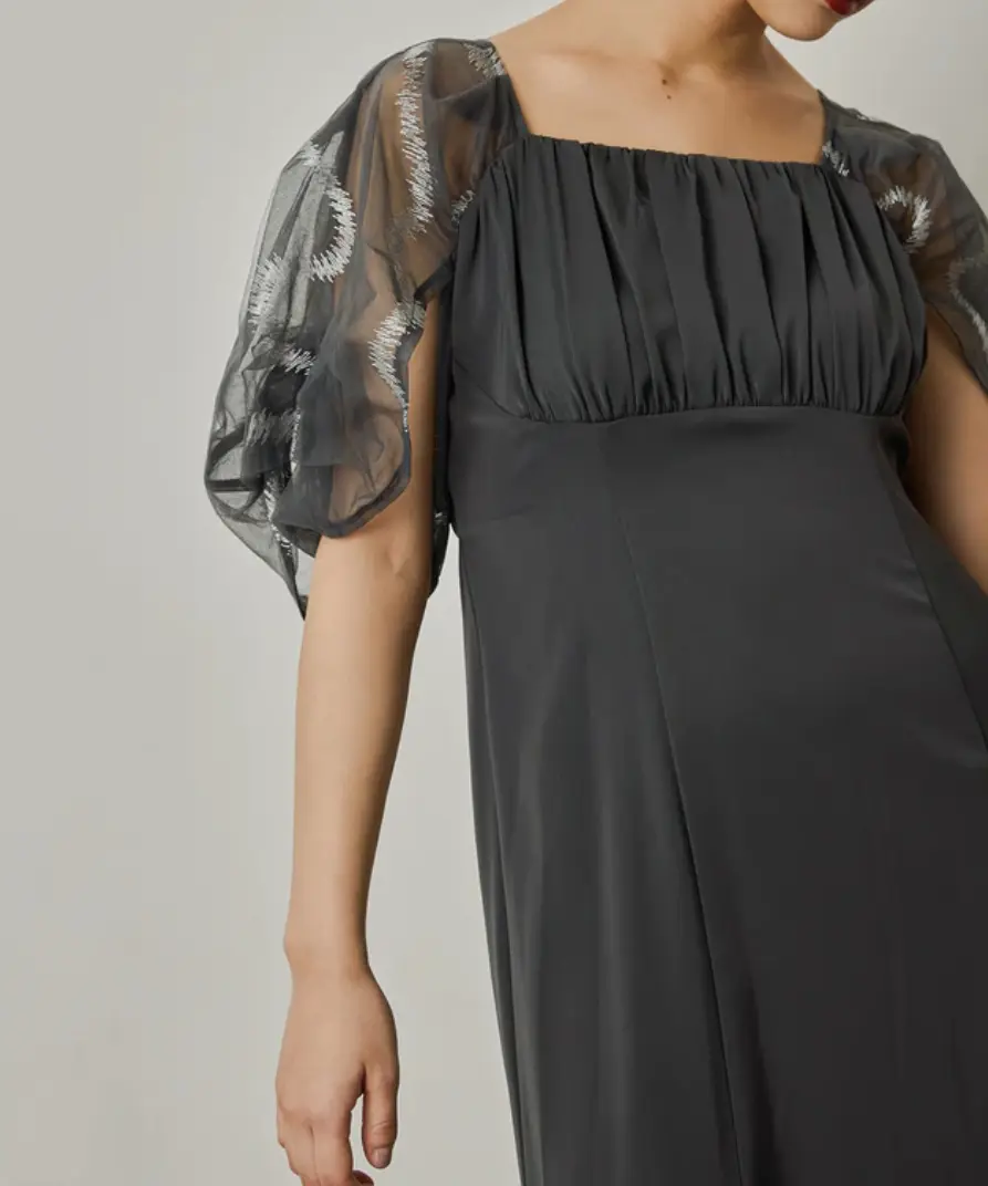 柔らかなチュールにニュアンス感たっぷりのグラフィティ柄の刺繍を施したスリーブドレス。