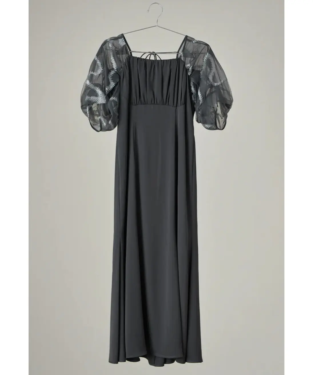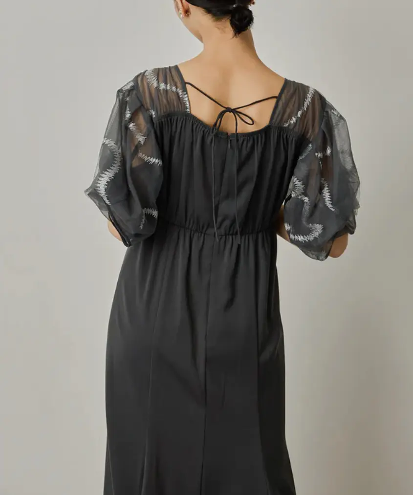 柔らかなチュールにニュアンス感たっぷりのグラフィティ柄の刺繍を施したスリーブドレス。