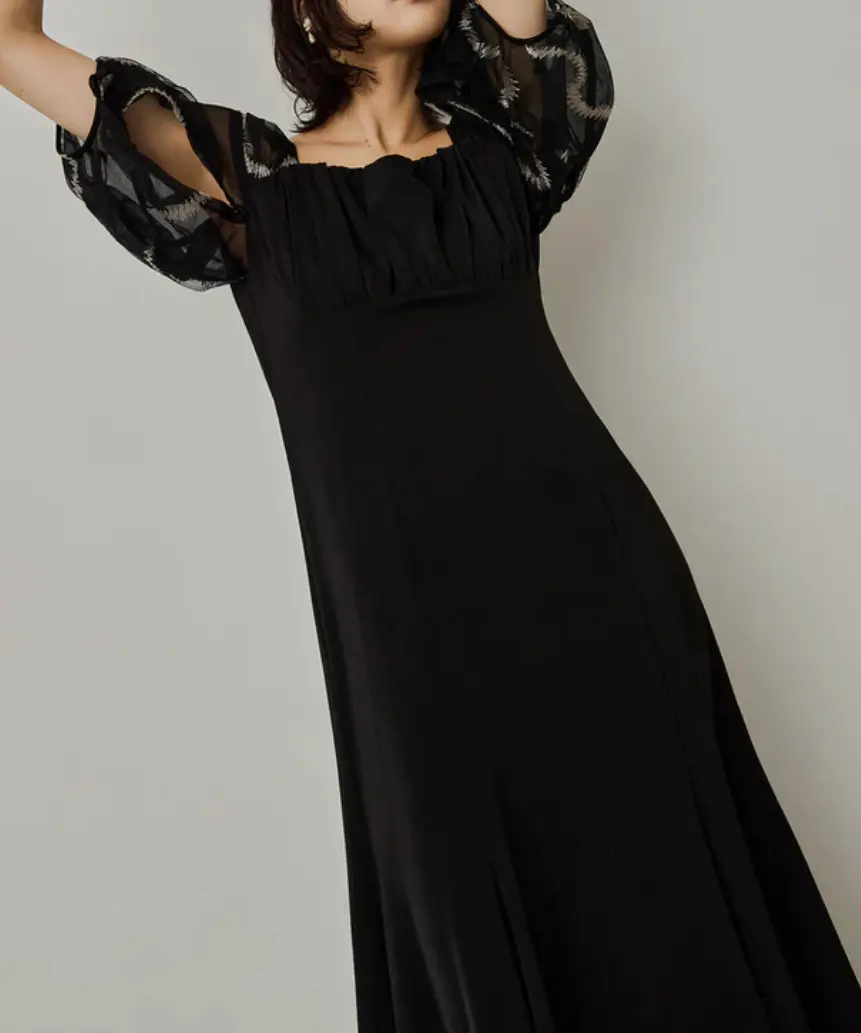 柔らかなチュールにニュアンス感たっぷりのグラフィティ柄の刺繍を施したスリーブドレス。