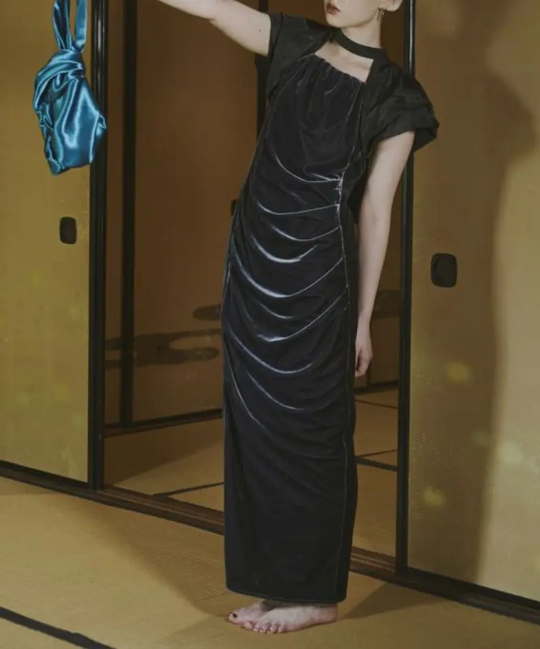 高級感あるベロア素材とドレープデザインで、華やかなオケージョンにぴったりの一着。