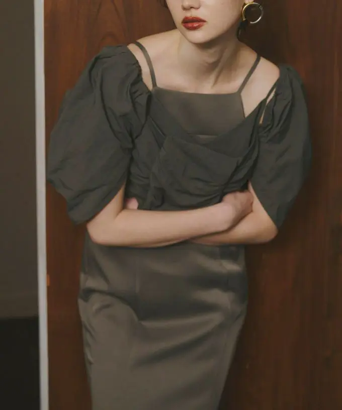グログラン生地のリボンディテールとボリューム袖が特徴的なトップスで、2way仕様の肩紐が魅力のドレス。