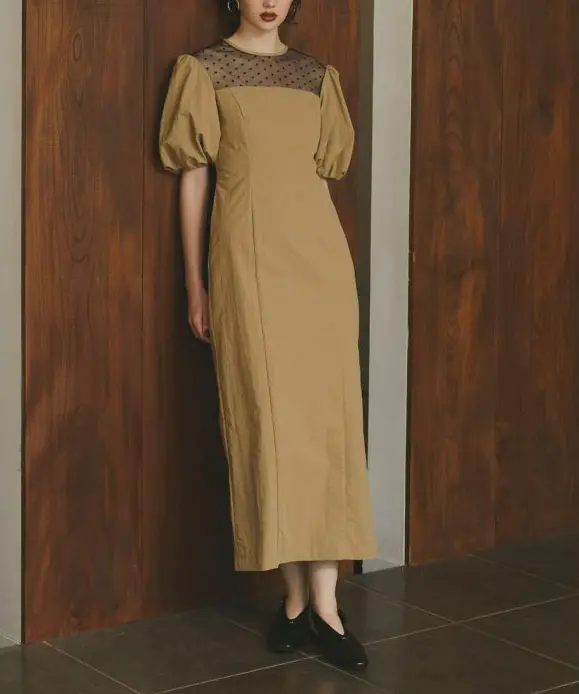 ワンピースはラフさを引き出すしわ感のあるナイロン素材で、低めのデコルテ切替がこなれ感を演出。