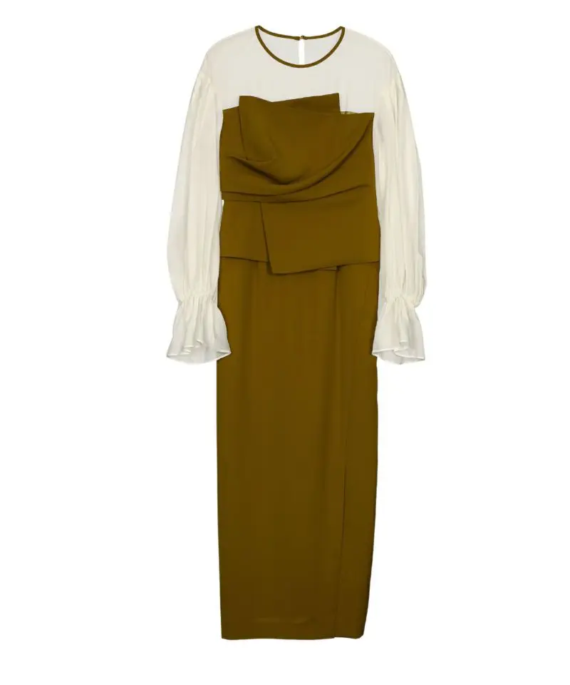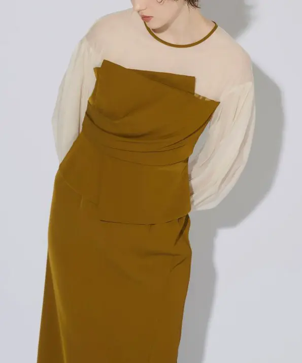 オーガンジー素材のヨークと袖、ドロップショルダーが軽やかさと柔らかな雰囲気を演出し、キャンディスリーブが華やかさを加えています。