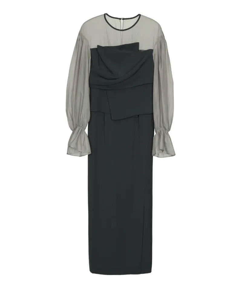 オーガンジー素材のヨークと袖、ドロップショルダーが軽やかさと柔らかな雰囲気を演出し、キャンディスリーブが華やかさを加えています。