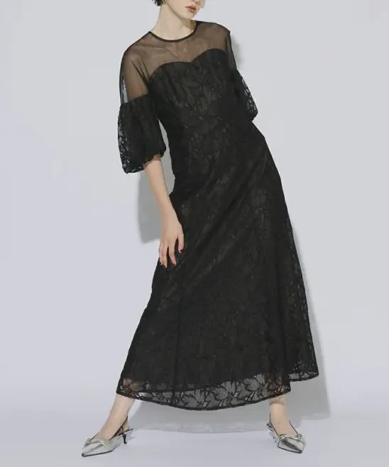 ドロップしたパフスリーブと胸元のカッティングが特徴で、チュール素材で透け感を演出し、オフショルのような抜け感を加えています。